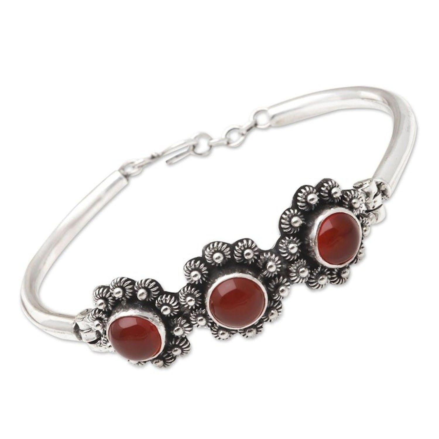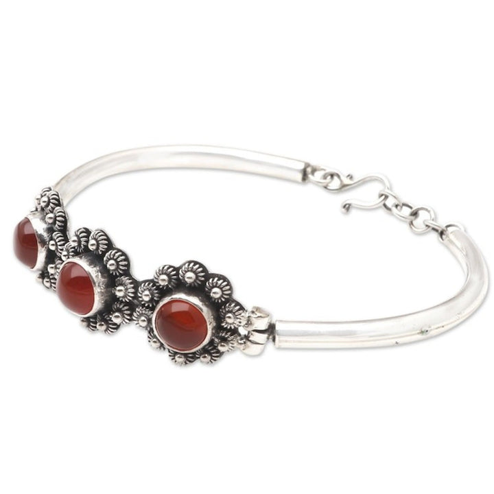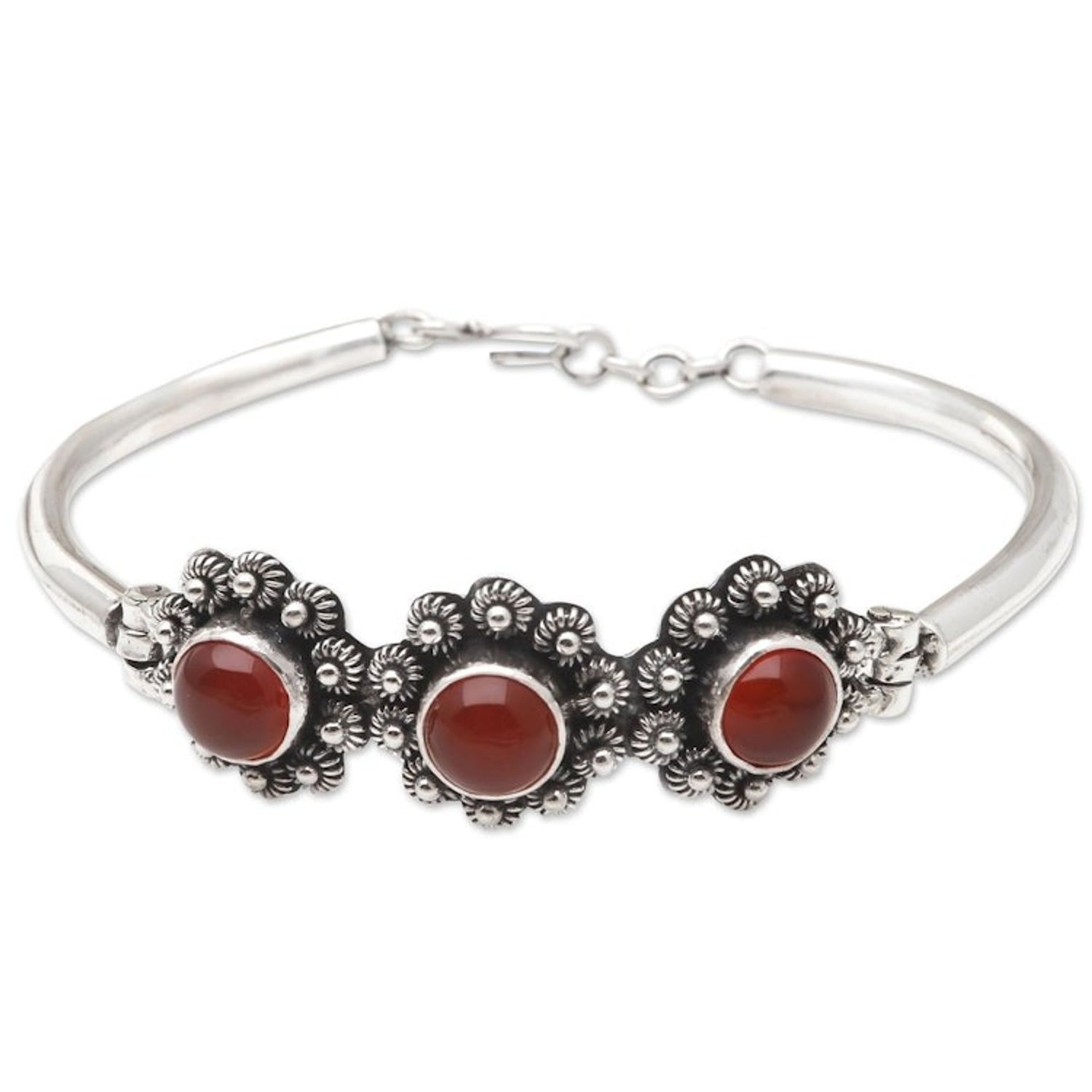 This 'Secret Lotus' Sterling Silver and Carnelian Bangle Bracelet by Independent Artisans is a lotus-themed bangle bracelet. Three opaque carnelian gems glow with a rich orange color at the center. Javanese artisans embellished the precious metal with smooth carnelian gemstones and baroque designs. A polished sterling silver band provides contrast and shine. The color may vary slightly.