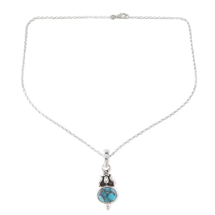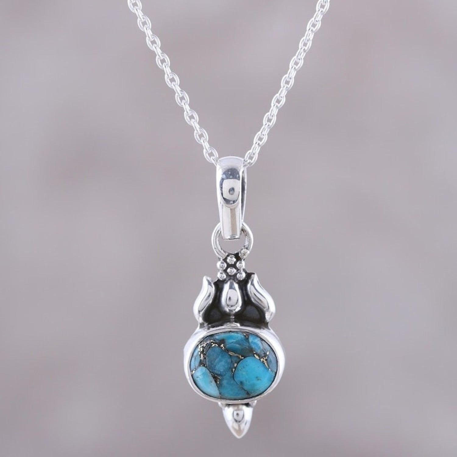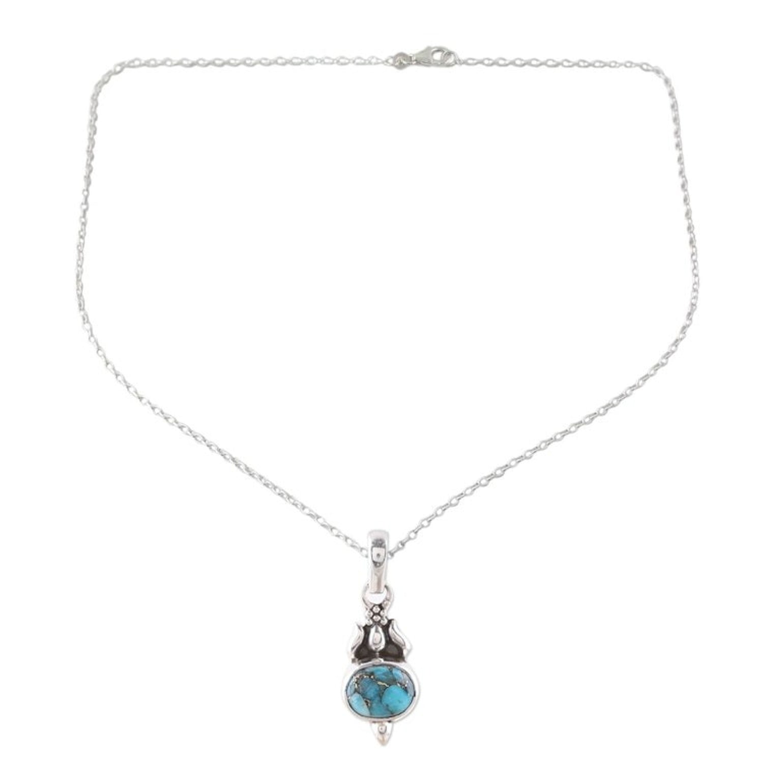 This 'Eden Promise' Sterling Silver and Composite Turquoise Necklace from India by Independent Artisans is a stunning pendant necklace for the modern woman. Crafted by hand from sterling silver, the necklace is centered by a mesmerizing oval cabochon of composite turquoise that shimmers magically from within a bezel setting. Elegant swirls and orbs of sterling silver decorate the top and bottom of the pendant, which has a combination finish. The color may vary slightly.
