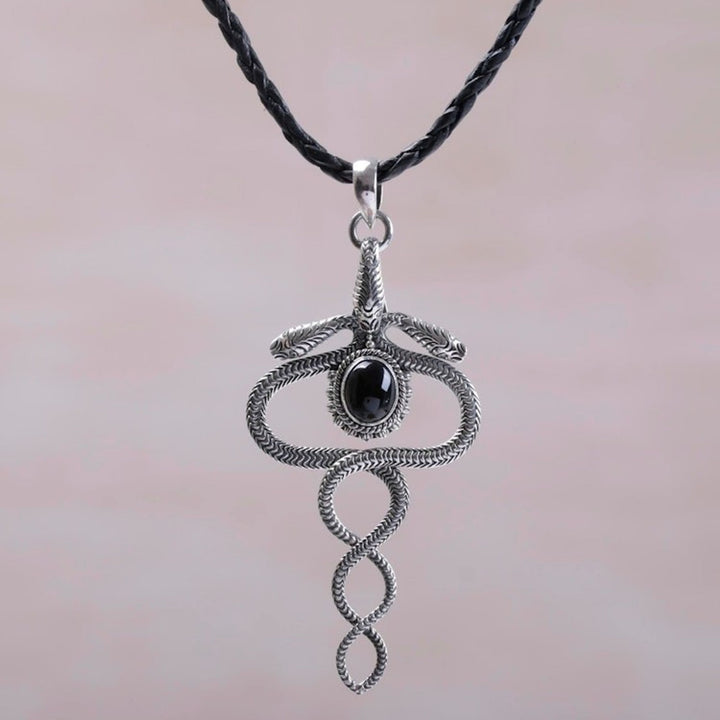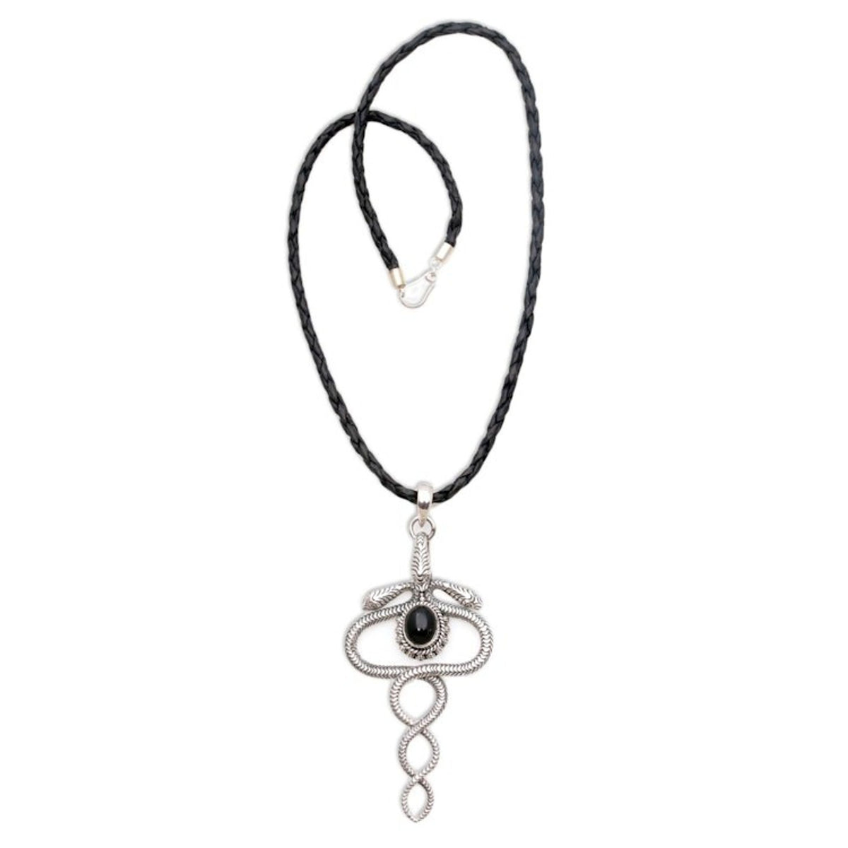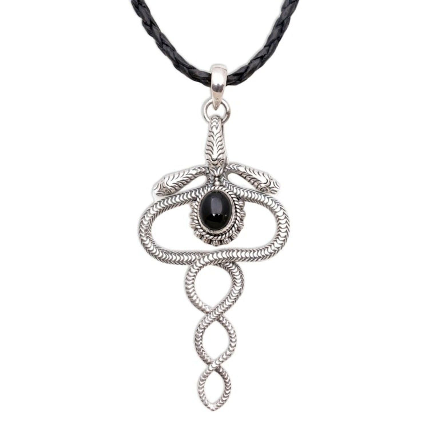This 'Twin Serpents' necklace by Independent Artisans is a novel and captivating piece inspired by nature and Balinese cultural artistry. Designed by Yuniati, the pendant features two sinuous sterling silver serpents intertwining to protect a sleek, oval black onyx. The contrast between the snakes' intricate scales and the smooth, dark gem is striking and beautiful. The pendant is worn on a braided black leather cord, offering a unique and versatile accessory that honors tradition while embracing modern appeal.