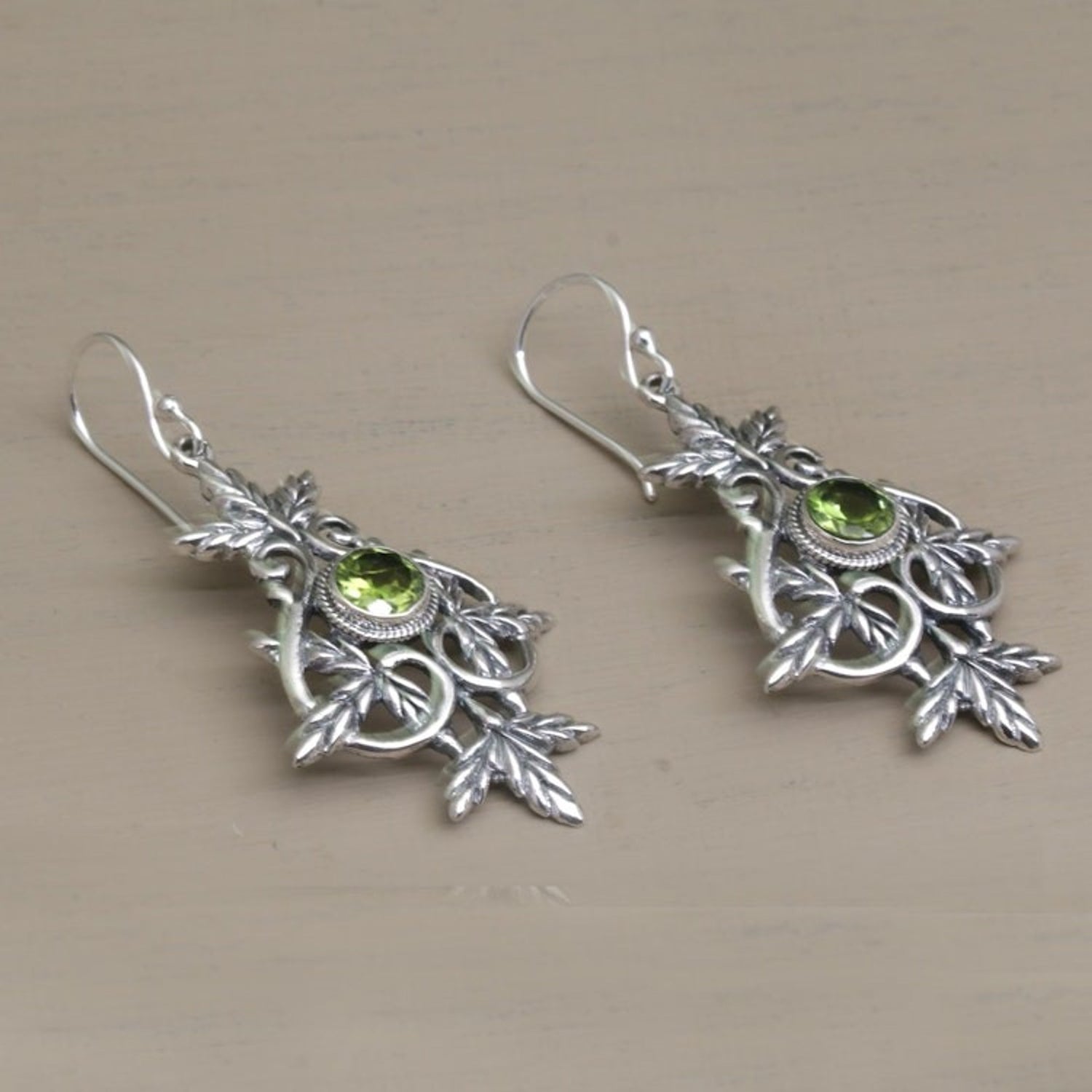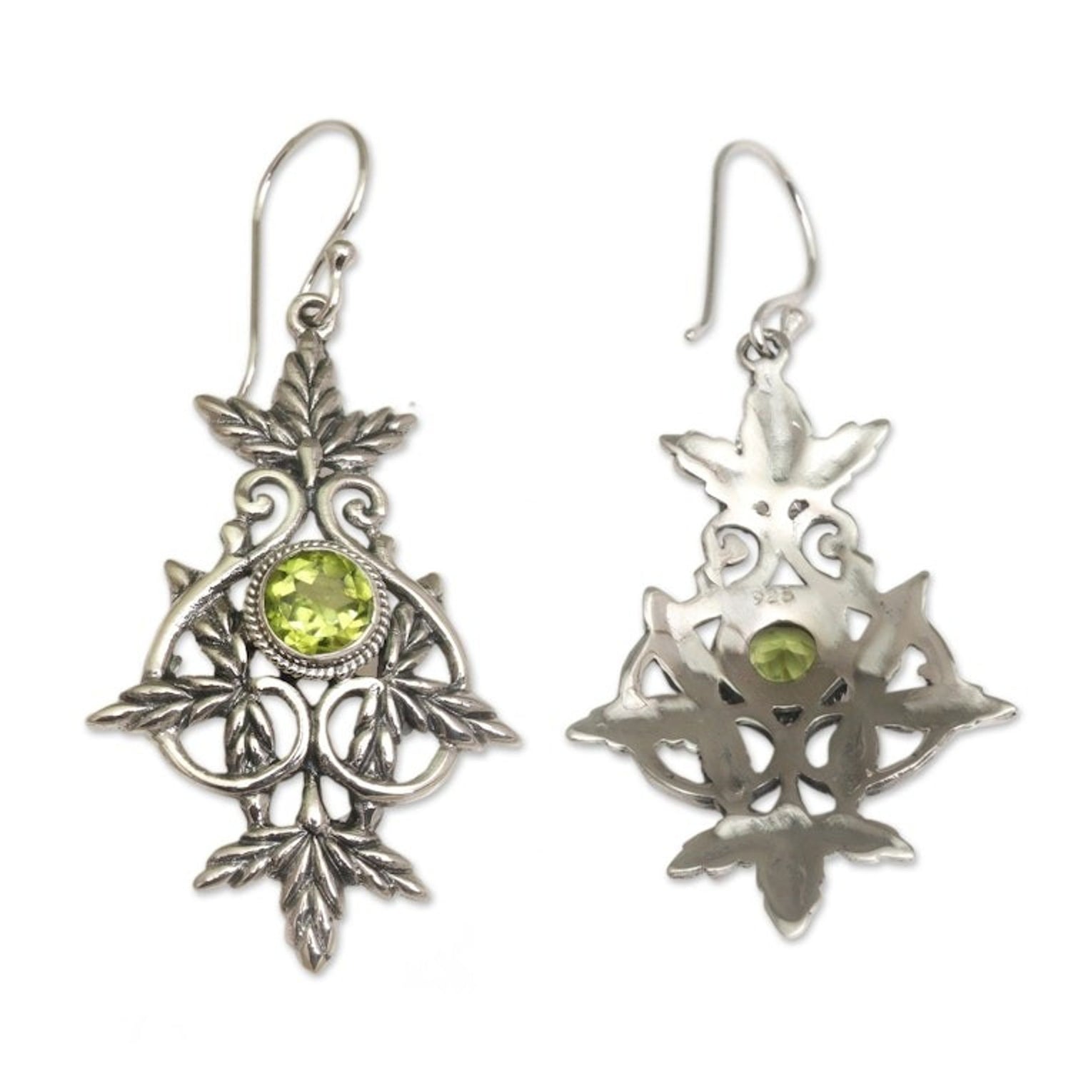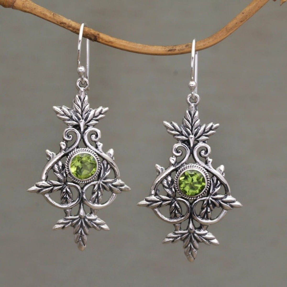 These 'Marvelous Vintage' earrings by Independent Artisans are an elegant statement piece with a design that hints of yesteryear. Crafted by Nyoman Rena, these sterling silver earrings feature intricate leaf motifs and beautiful silver flourishes. Sparkling peridot gems, totaling 1.5 carats, are set at the center of the earrings, which swing gracefully from sterling silver hooks. The combination finish of the silver adds depth and a sense of timelessness to this beautiful and classic design.