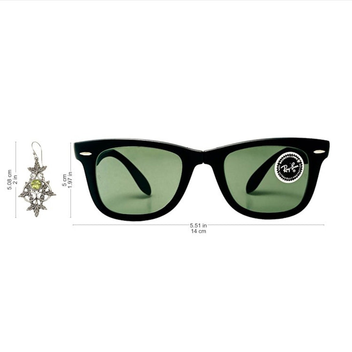 Handcrafted in 925 sterling silver with a natural peridot stone, these hook earrings feature a combination finish and measure 2 inches in length by 0.9 inches in width.