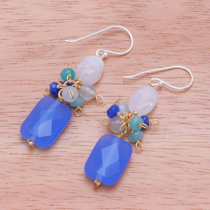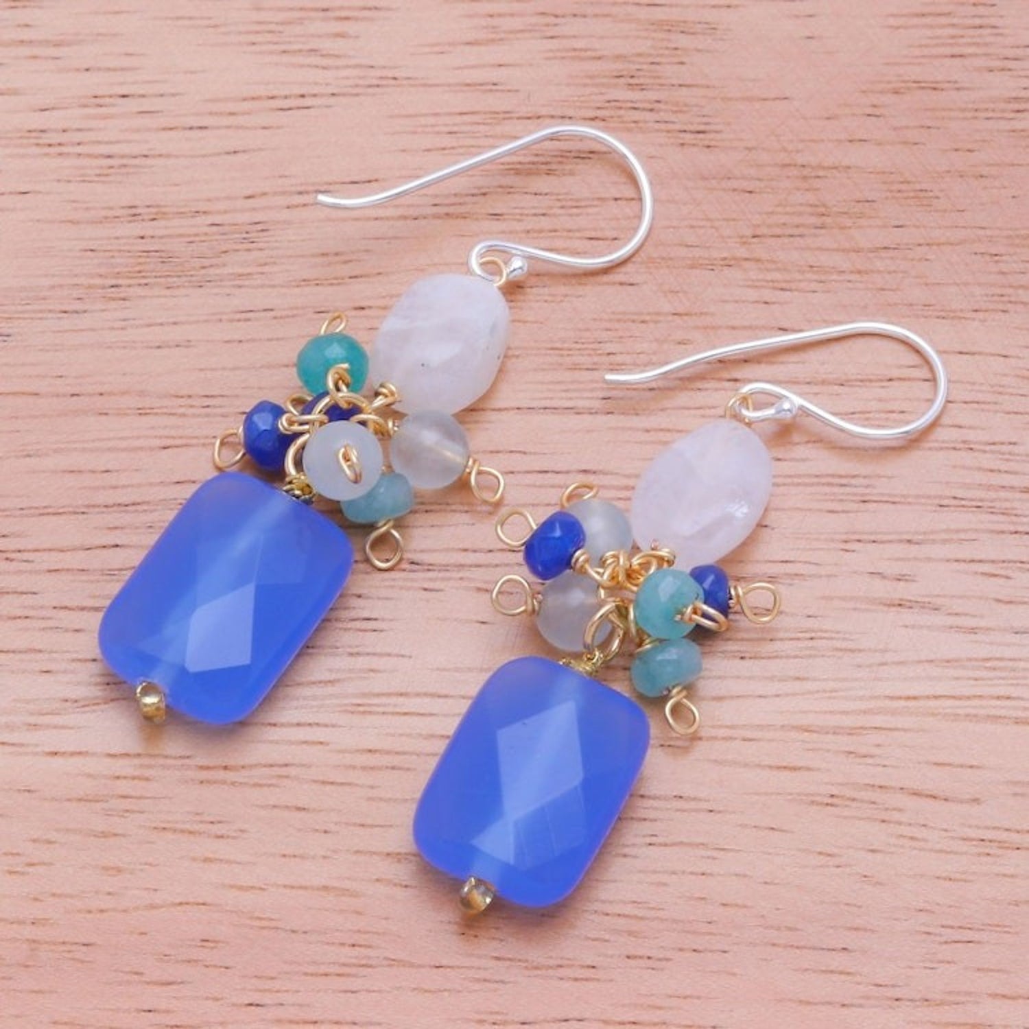 These 'Blueberry Soda' earrings by Independent Artisans are a colorful and whimsical pair of dangle earrings that chase away dull days. Designed by Nareerat, a Thai artisan, these earrings feature a cluster of dyed quartz stones in cool colors, hand-knotted with shimmering metallic thread. A large blue glass bead hovers below the cluster, and a cool white quartz bead dangles above, all from sterling silver hooks. This piece is a celebration of community, craftsmanship, and the art of handmade jewelry.