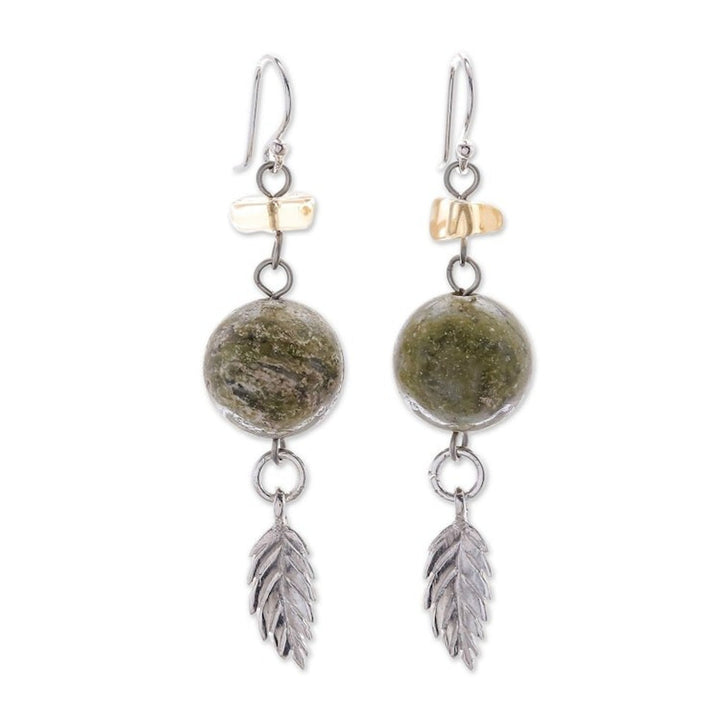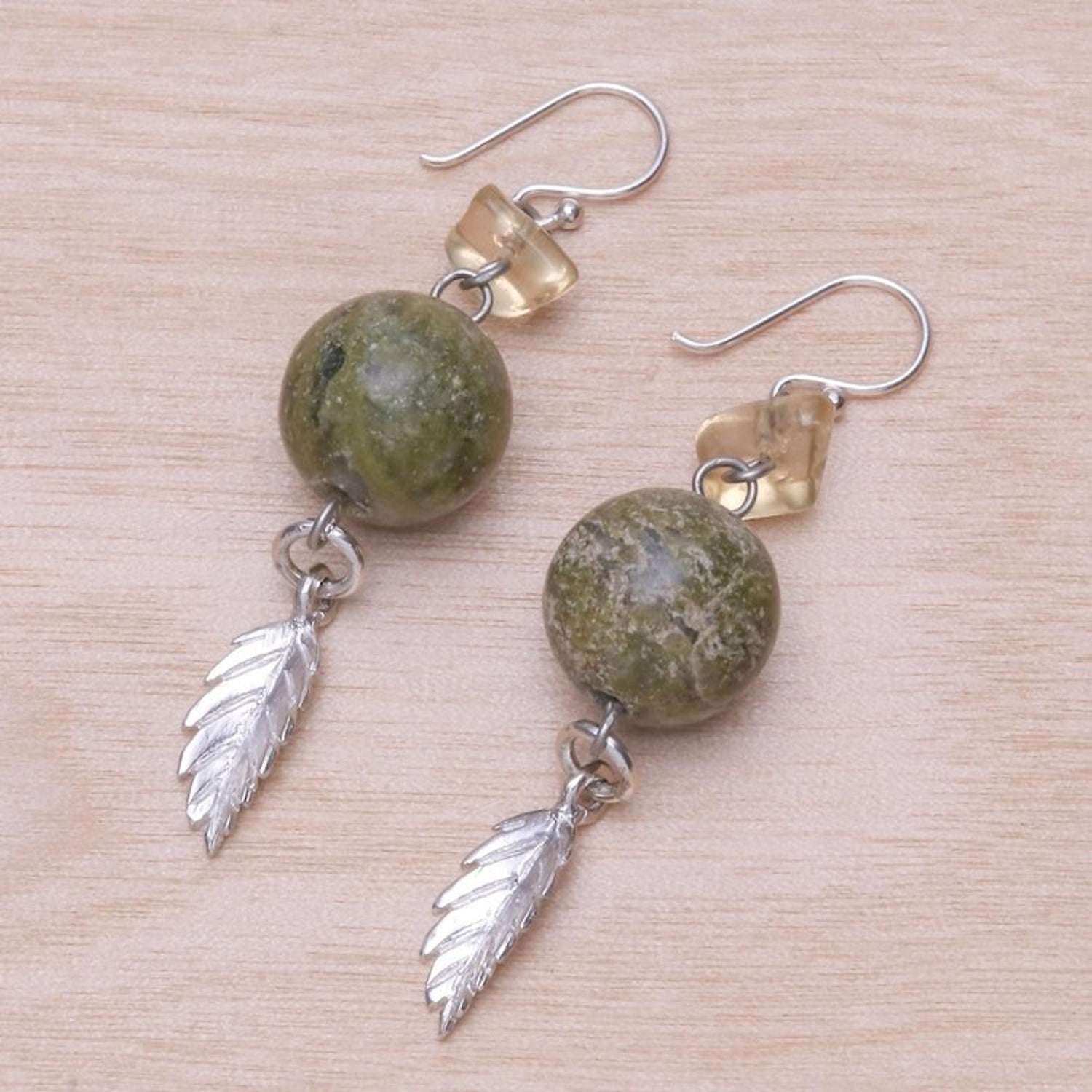 These 'Cool Forest' earrings by Independent Artisans are a lovely pair that evokes a serene, natural vibe. Designed by Srimuang, these dangle earrings combine the moss-green unakite with sunny citrine, creating a beautiful and refreshing color palette. The handcrafted earrings culminate in a delicate silver leaf, adding a finishing touch inspired by nature. This piece reflects the artisan's commitment to creating jewelry that is personal and expressive.