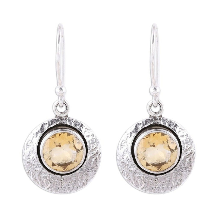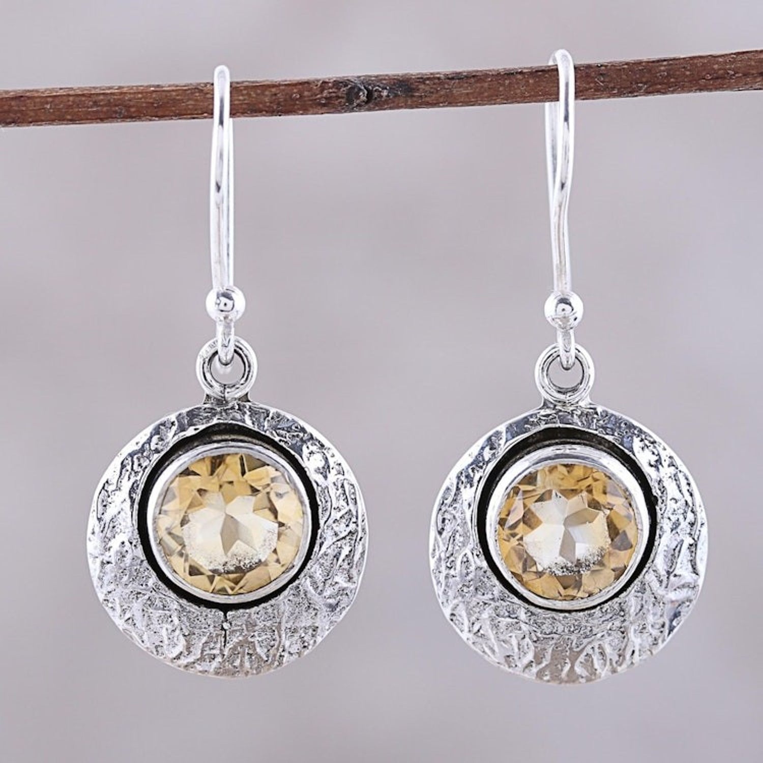 These 'Lemon Orbs' earrings by Independent Artisans are a dazzling pair that brims with the freshness of tart lemons. Designed by Shanker, these round dangle earrings are centered with four carats of sparkling yellow citrine gemstones. The sterling silver settings feature a textured, hammered finish that adds a beautiful contrast and unique character. This piece is a testament to the artisan's commitment to quality, originality, and the artistry of his craft.