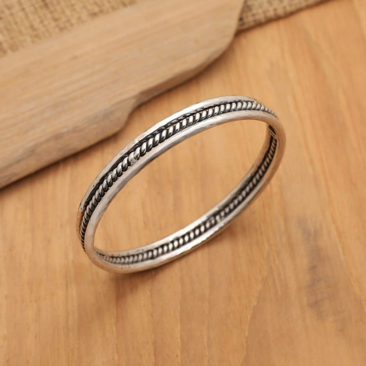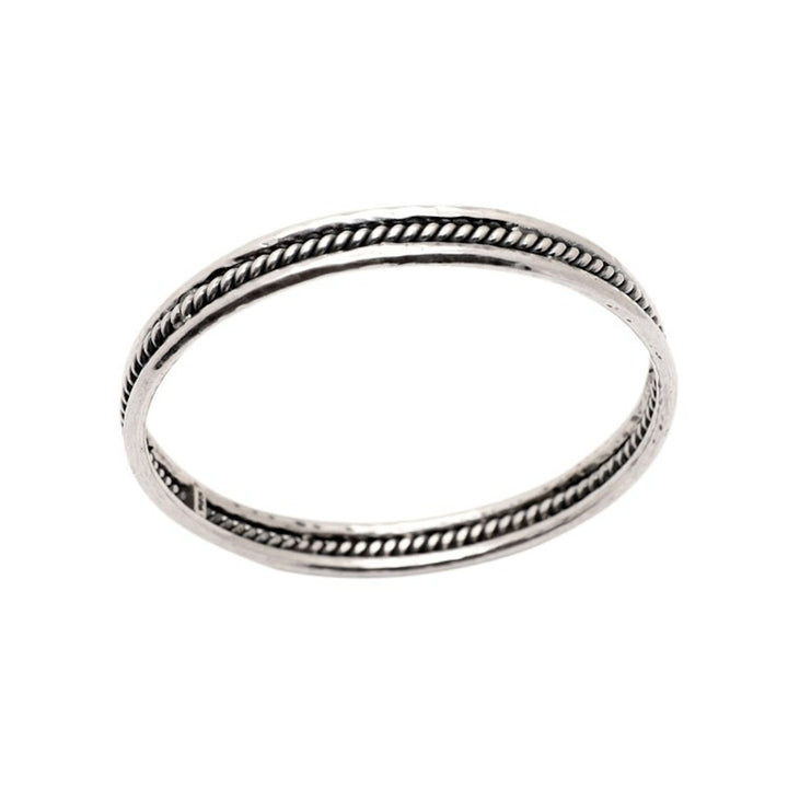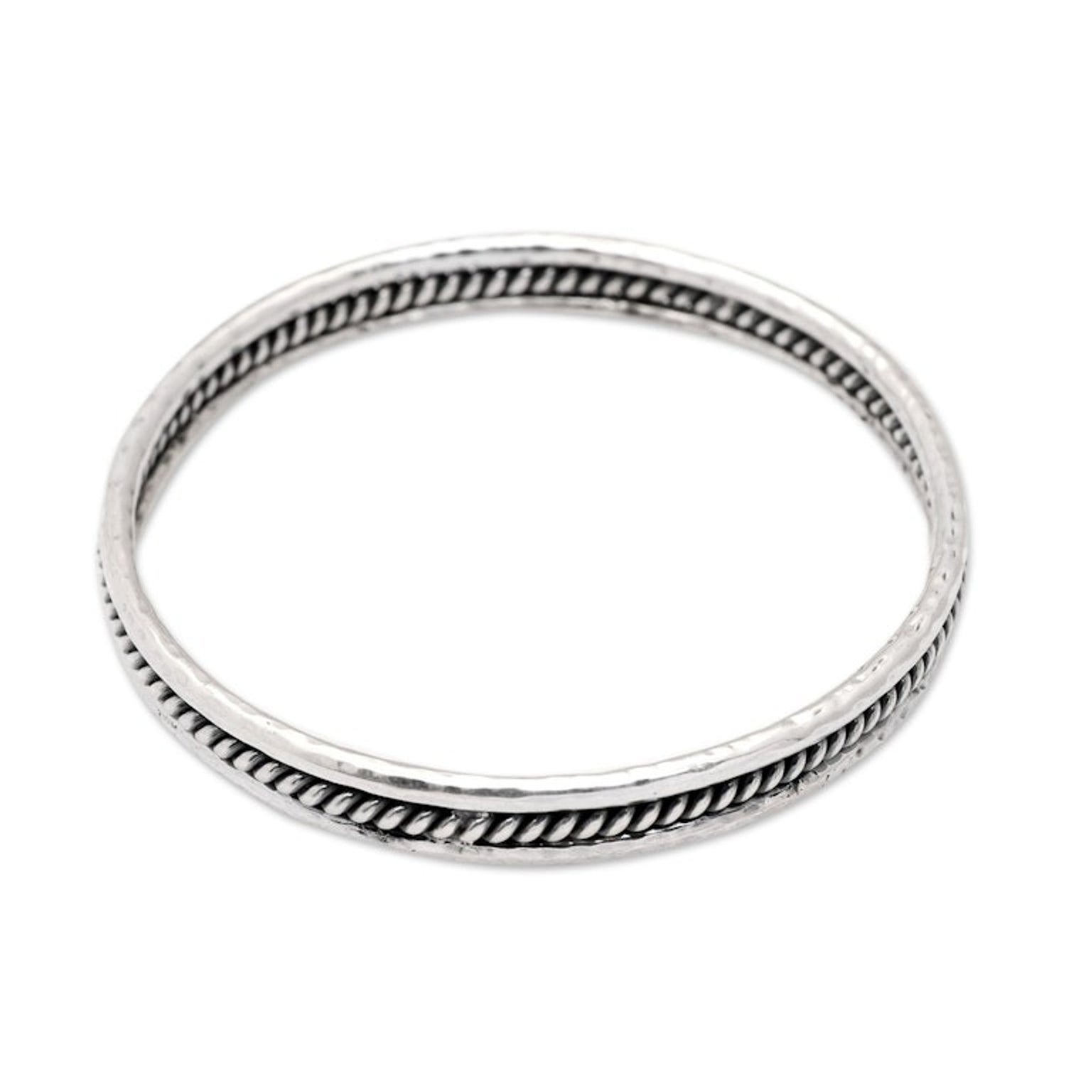 This 'Charming Loop' bangle bracelet by Independent Artisans is a stunning piece that showcases traditional Balinese craftsmanship. Designed by Cahya Krisna, this sterling silver bangle bracelet features a unique combination of meticulously hammered, polished, and oxidized finishes. The "torsade-like accents" add an intricate and sophisticated detail. This bracelet is perfect for any occasion, from an evening soiree to a casual brunch.