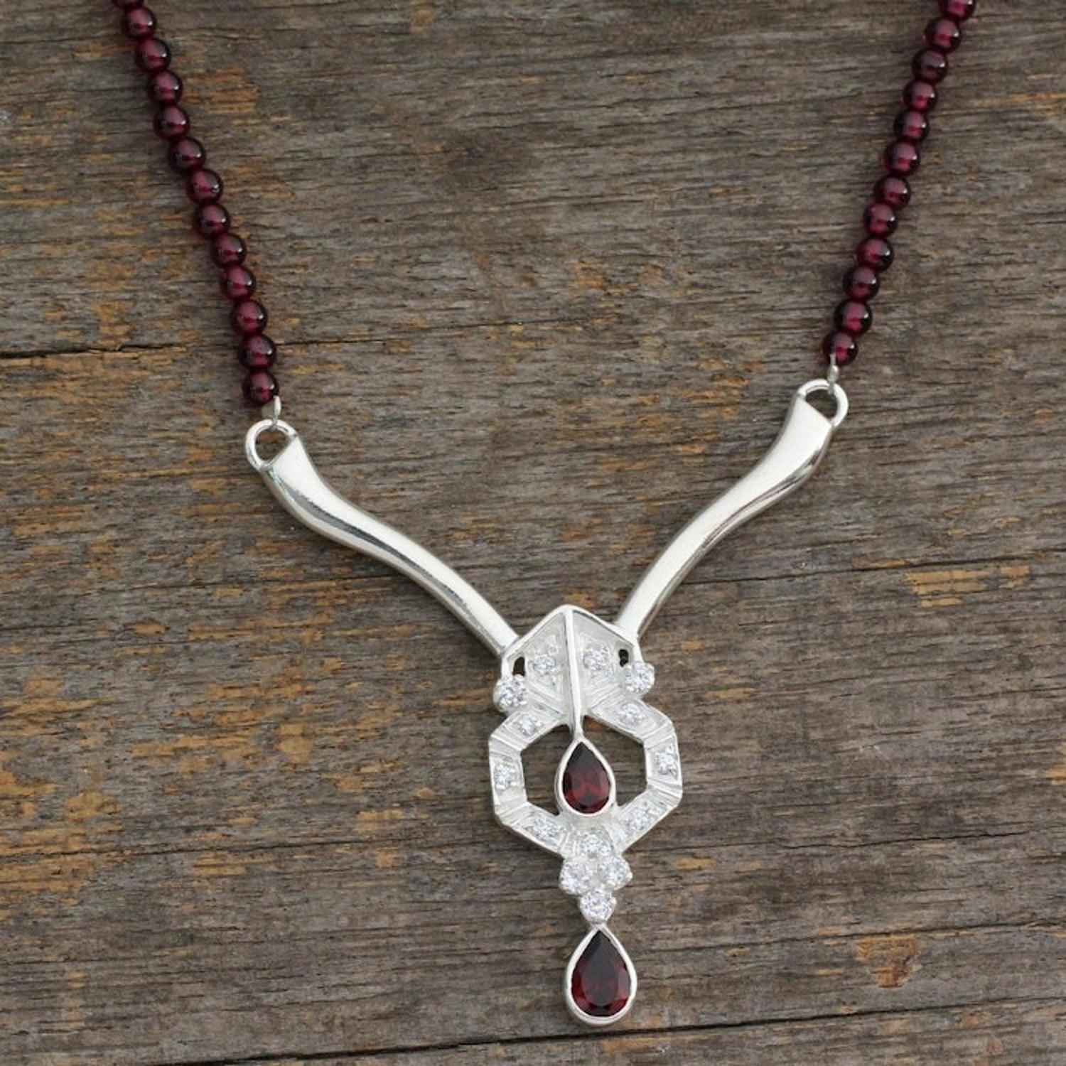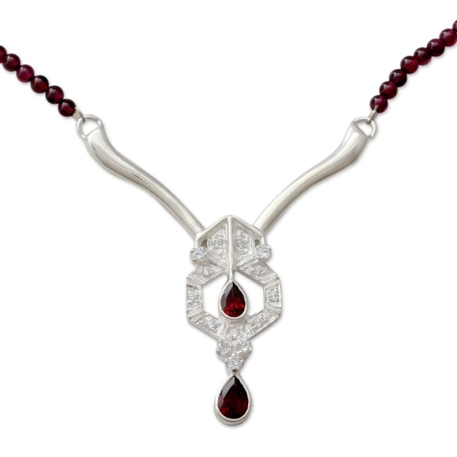 This 'Sophisticate' necklace by Independent Artisans is an exceptional piece that explores the essence of elegance. Designed by Bhavesh, this sterling silver necklace showcases two garnet teardrops and an original pendant that hangs from a strand of garnet globes. The pendant is accented with sparkling cubic zirconia, adding a touch of glamour. This necklace is a testament to the artisan's ability to blend timeless Indian artistry with modern trends.