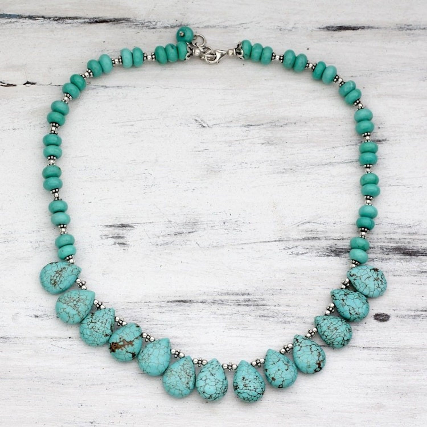 This 'Fortune's Friend' necklace by Independent Artisans is a wondrous and beautiful accessory. Designed by Narayani, this necklace features "magnesite raindrops" that alternate with sterling silver beads. The combination finish gives the silver a rustic yet elegant look, and the serene blue of the stones adds a sense of calm and beauty. This piece reflects the intimate spirit of family, tradition, and artistry.