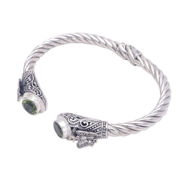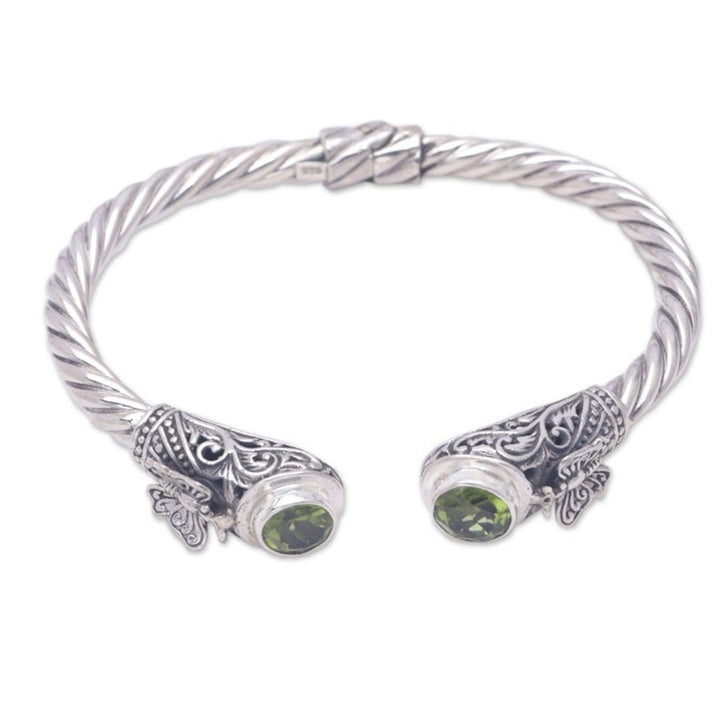 This 'Green Butterfly' cuff bracelet by Independent Artisans is a wondrous and magical piece. Designed by Giri Tasmana, this sterling silver cuff bracelet features traditional Balinese motifs and is crowned with little metal butterflies. Each end of the bracelet features radiant peridot stones totaling over two carats. The combination finish adds an elegant touch to the whole piece, which is inspired by Indonesia's rich flora and fauna.