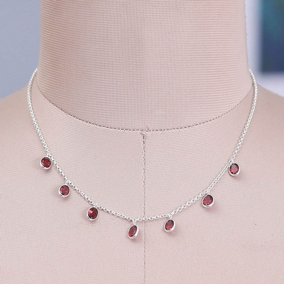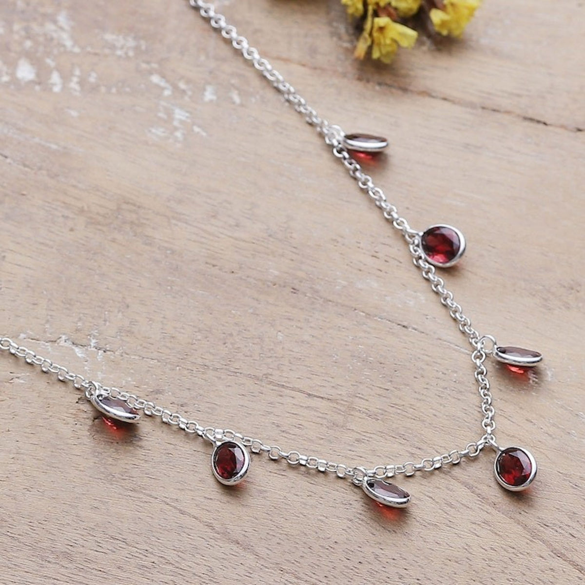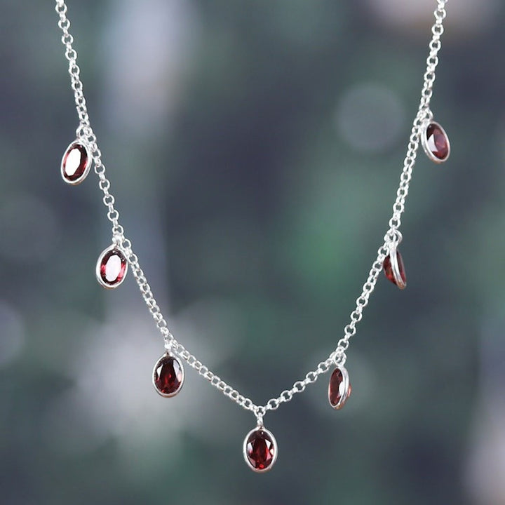 This 'Dancing Devotion' necklace by Independent Artisans is an exquisite sterling silver charm necklace. Designed by Alok Jain, this refined piece features sublime, natural garnet stones in an oval cut, totaling seven carats. The stones "dance majestically" from the polished rolo chain, bringing a sense of passion and romance. This necklace reflects a balance between timeless style and evolving fashion.