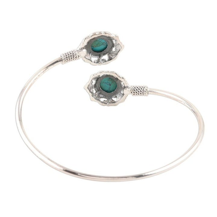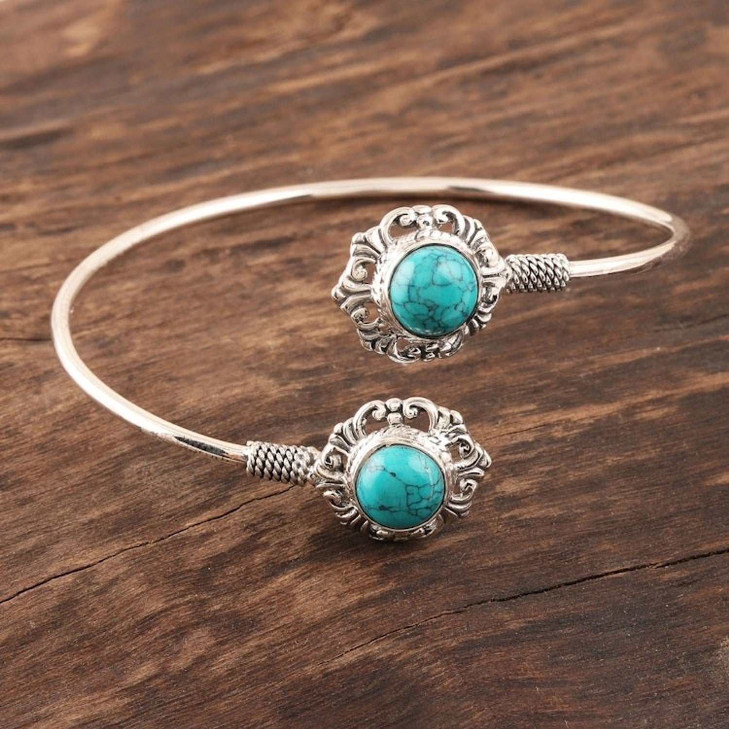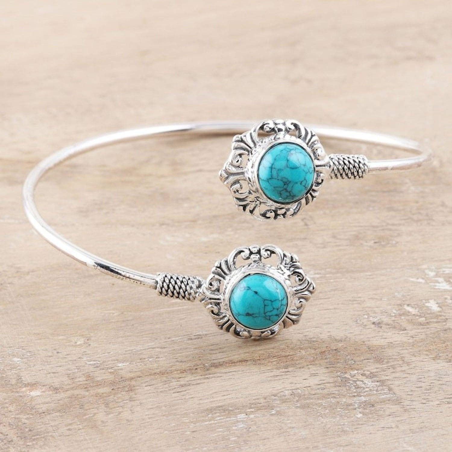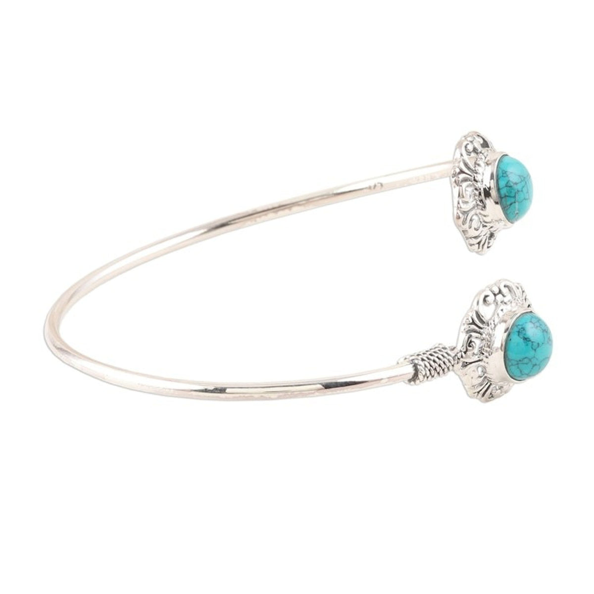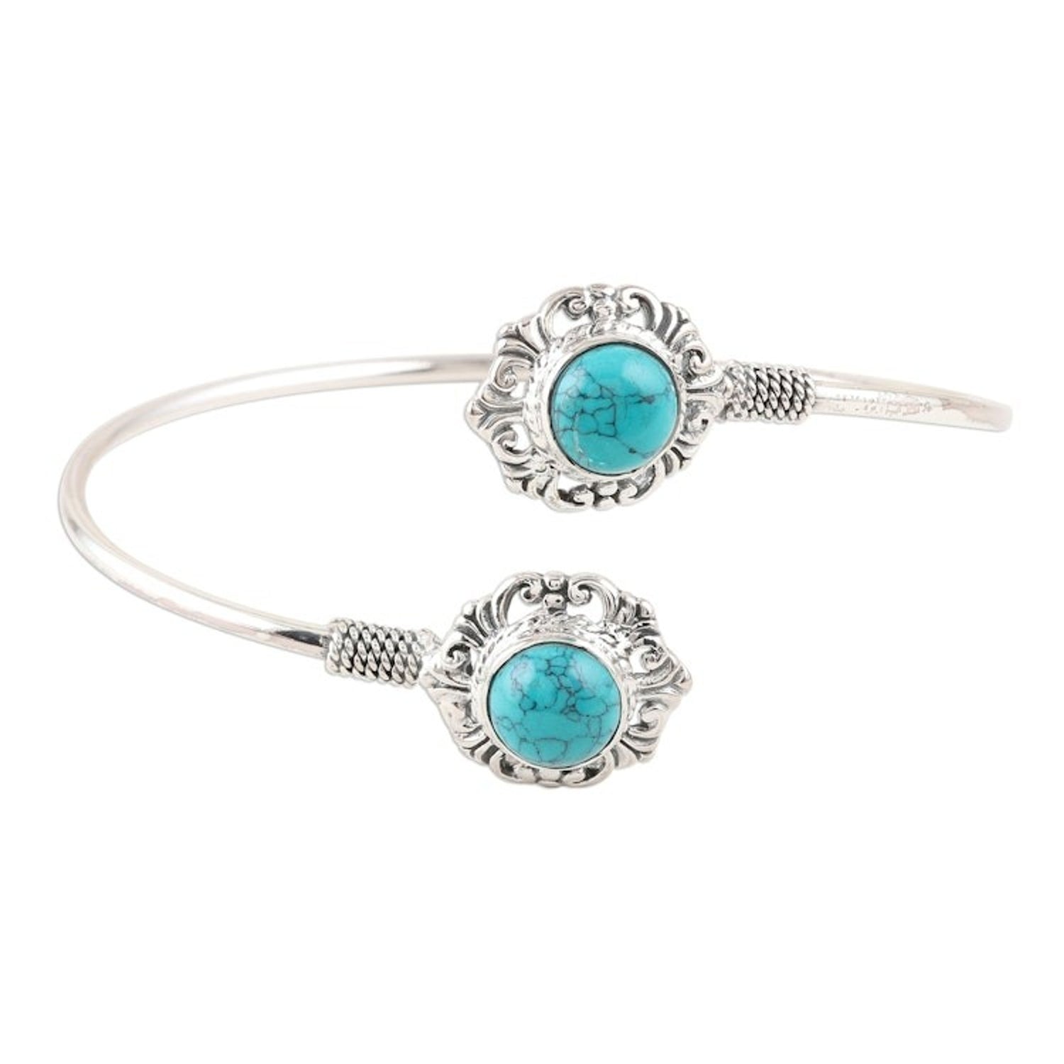 This 'Agra Alignment' cuff bracelet by Independent Artisans is a pretty accessory with ornate ends. Designed by Alok Jain, this sterling silver cuff bracelet is crafted by local artisans. The ornate ends are set with cabochons of cool blue reconstituted turquoise. This piece reflects a balance between timeless style and evolving fashion, while providing opportunity for the families who bring each creation to life.