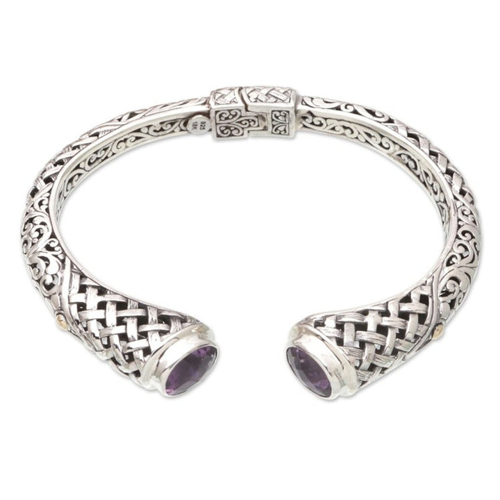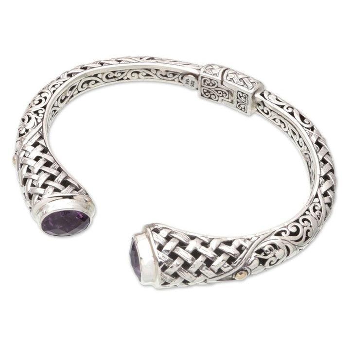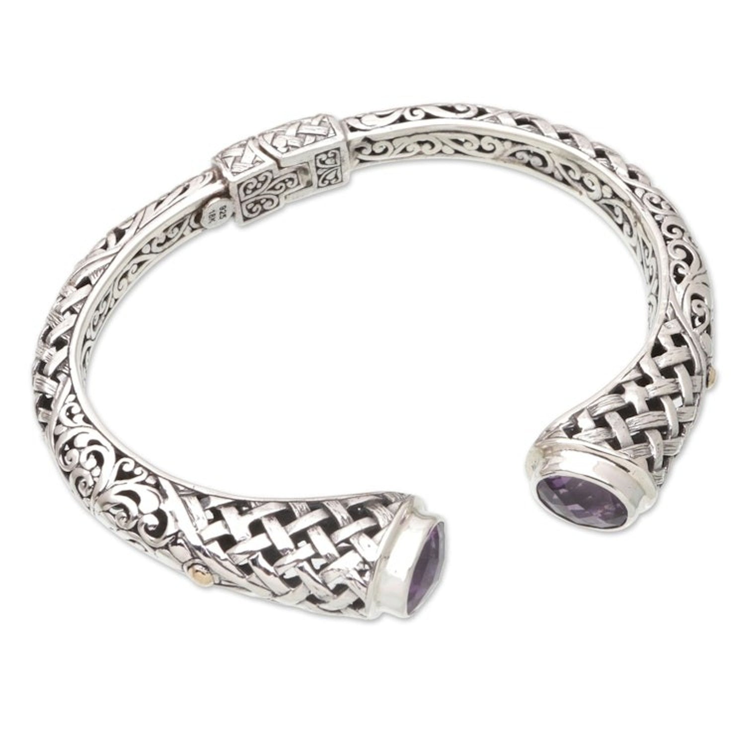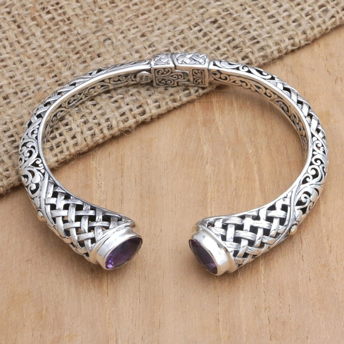This 'Purple Heritage' cuff bracelet by Independent Artisans is a fabulous creation with traditional motifs. Designed by Dewi Putera, this sterling silver cuff bracelet features a combination finish. The final touch is in the faceted amethyst stones totaling over three carats. This piece celebrates Balinese culture and emphasizes the unique beauty of handmade silver jewelry.