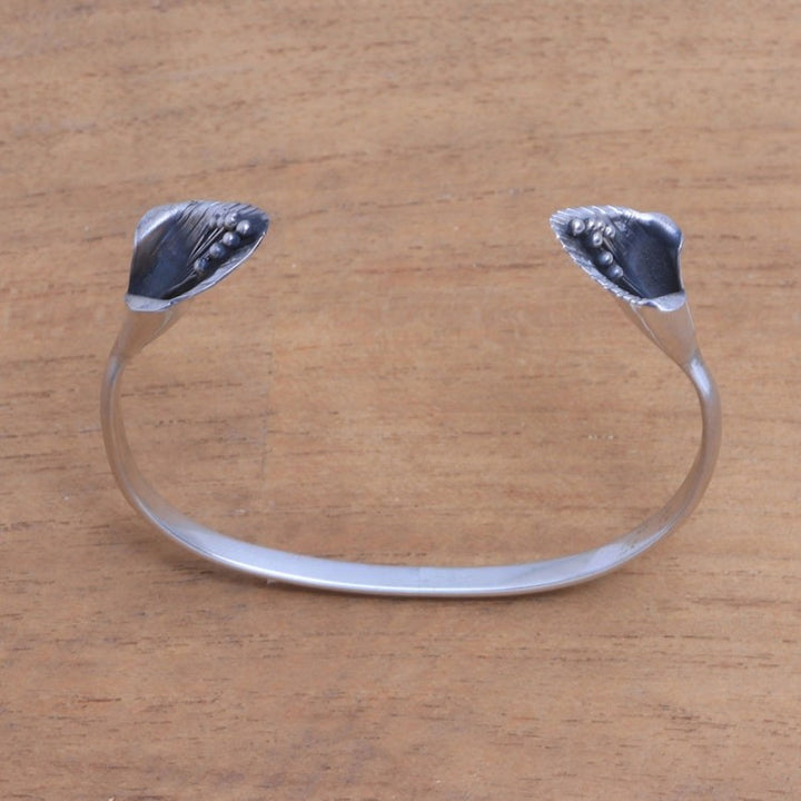 This 'Floral Twins' cuff bracelet by Independent Artisans is a majestic accessory with a high-polish band. Designed by Nyoman Rena, this sterling silver cuff bracelet is capped at the ends with two floral twins. The combination finish gives it a lovely texture. This piece captures both Balinese heritage and contemporary design, blending carving skills with metalwork.