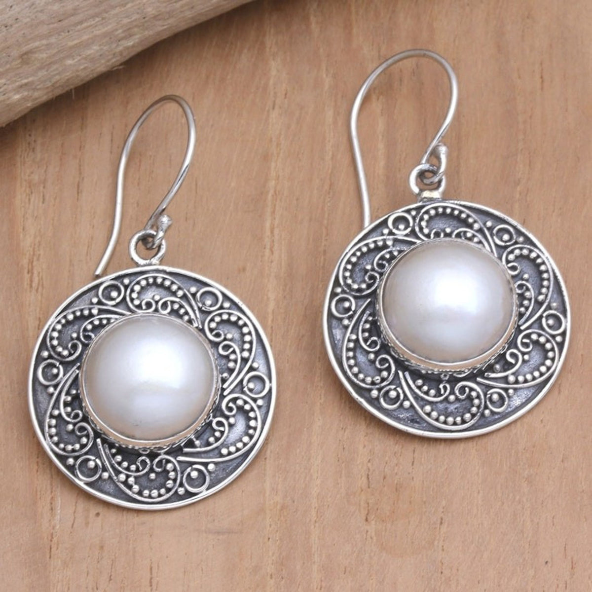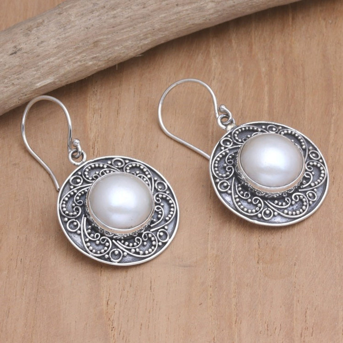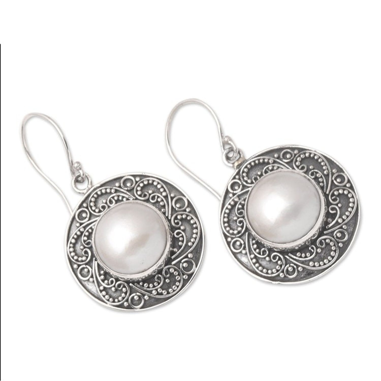 These 'Heavenly Blossoms' dangle earrings by Independent Artisans are an alluring pair of earrings ideal for professional or casual occasions. Designed by Yuniati, these sterling silver earrings feature traditional Balinese motifs with precious pale peach cultured pearls as the centerpiece. This piece is a testament to dedication, cultural pride, and creative passion.