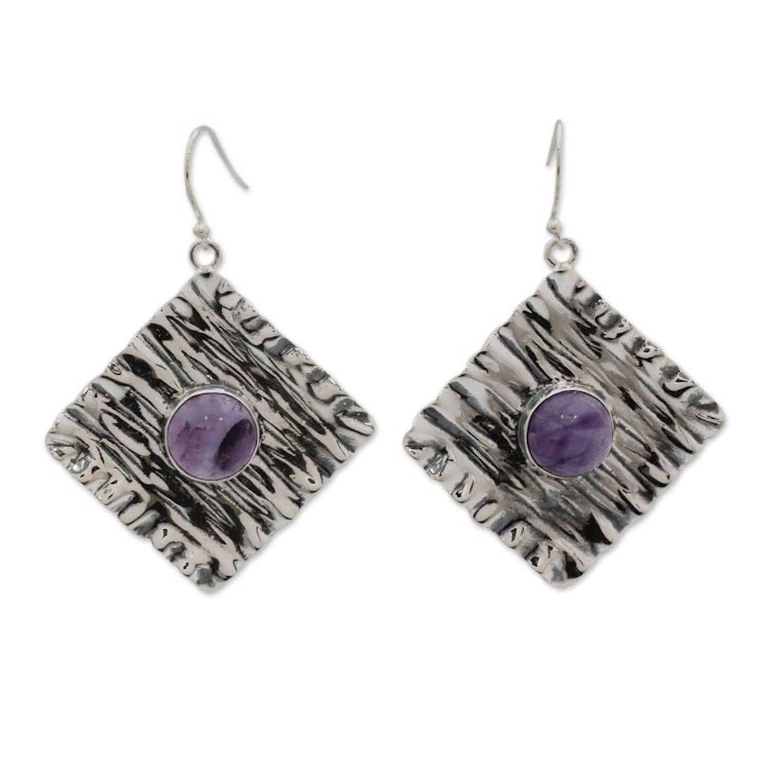 These 'Purple Connection' dangle earrings by Independent Artisans are a stunning and entertaining accessory. Designed by Chintan, these sterling silver earrings feature amethysts at the center. Random lines and diagonal grooves with oxidized accents create "entertaining textures." This piece reflects cultural heritage while appealing to evolving tastes.