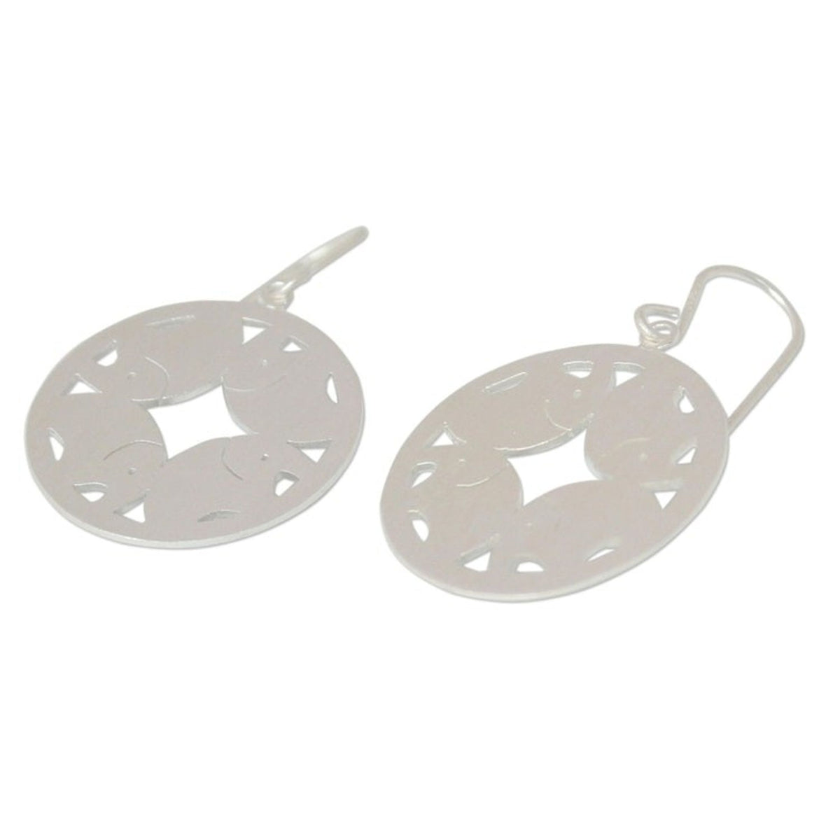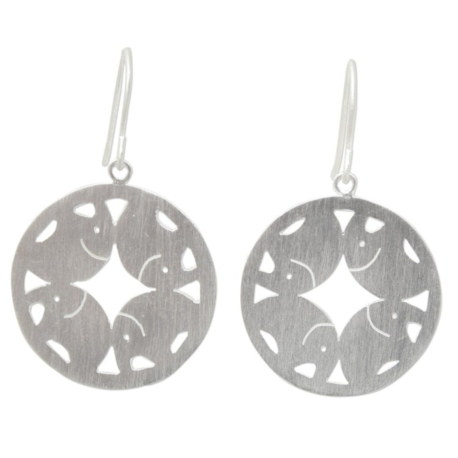 These 'Elephant Moon' dangle earrings by Independent Artisans are an artistic and mystical accessory. Designed by Jantana, these sterling silver earrings feature elephants marching in a circle around the "mystical Thai moon." The matte finish adds a beautiful texture. This piece balances delicacy and modern appeal, and is a way to share joy, beauty, and craftsmanship with the world.