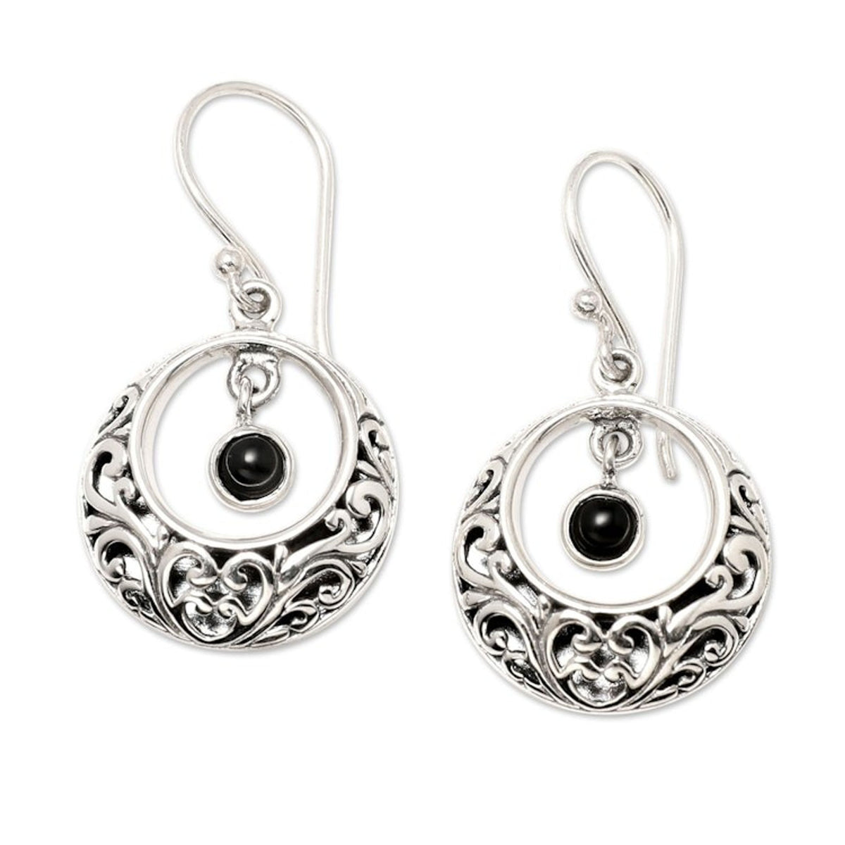 These 'Baturiti Garden in Black' dangle earrings by Independent Artisans are a dreamy and elegant accessory. Designed by Ketut Udiana, these sterling silver earrings showcase beautiful onyx gemstones and intricately carved motifs. The blend of polished and oxidized finishes adds depth and texture. This piece embodies patience, precision, and pride in Bali's artisanal legacy.
