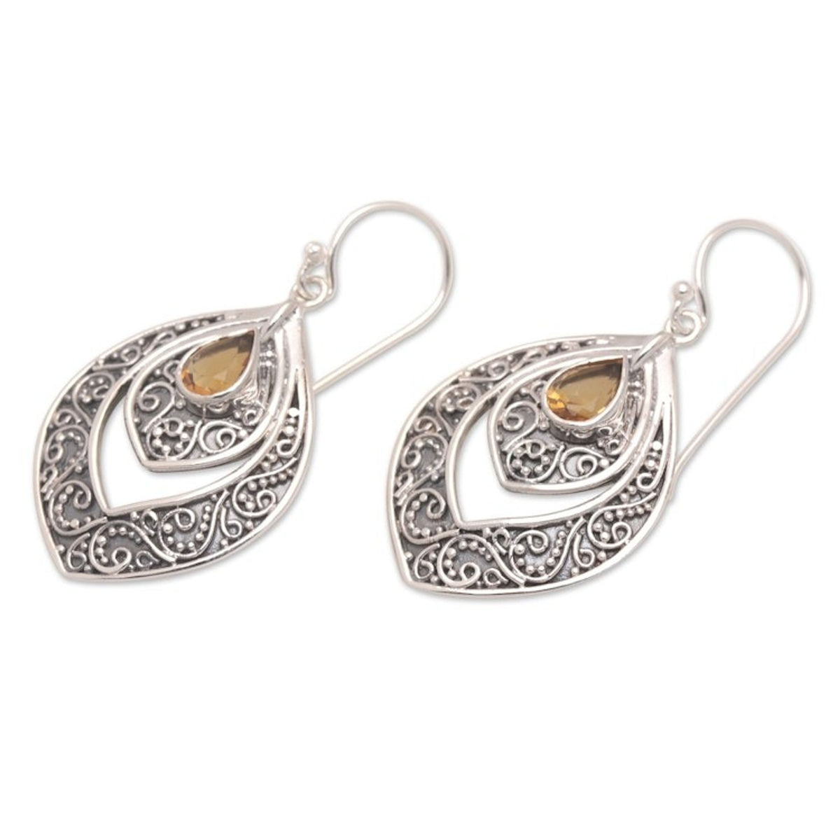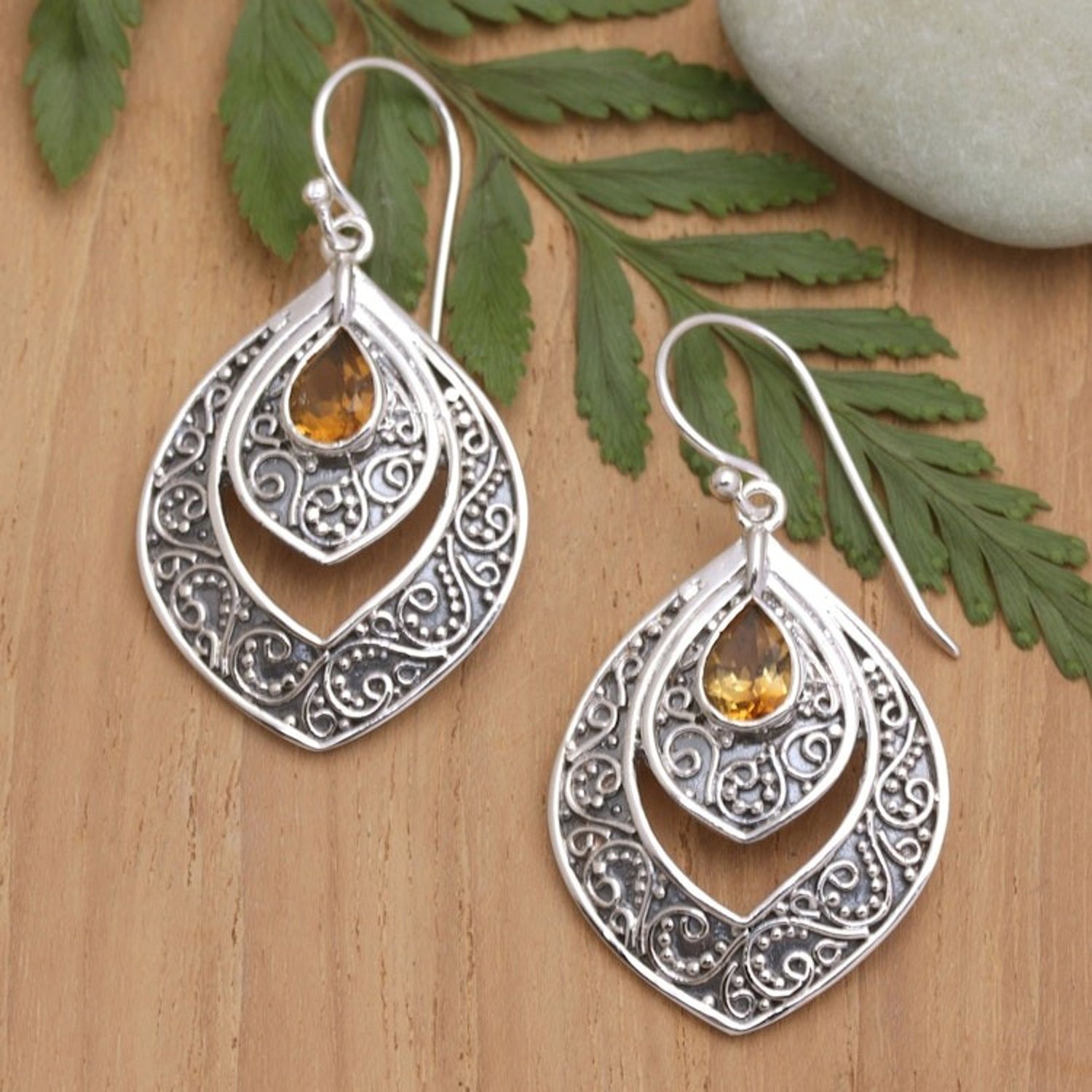 These 'Party Queen in Yellow' dangle earrings by Independent Artisans are a scintillating and lovely accessory. Designed by Anya, these sterling silver earrings feature "two layers of teardrop frames" with a "unique oxidized finish" and lovely swirl motifs. They also have a citrine gemstone. This piece is a way to "infuse Balinese tradition into fresh designs for a global audience."
