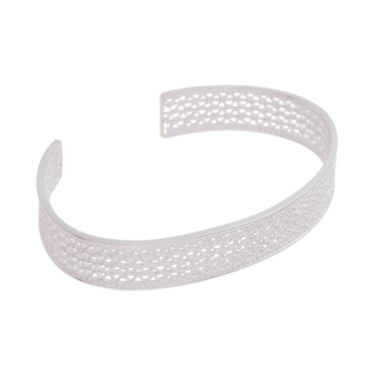 Handcrafted in 925 sterling silver, this cuff bracelet has a high-polish finish and measures 5.5 inches in length by 0.4 inches in width.
