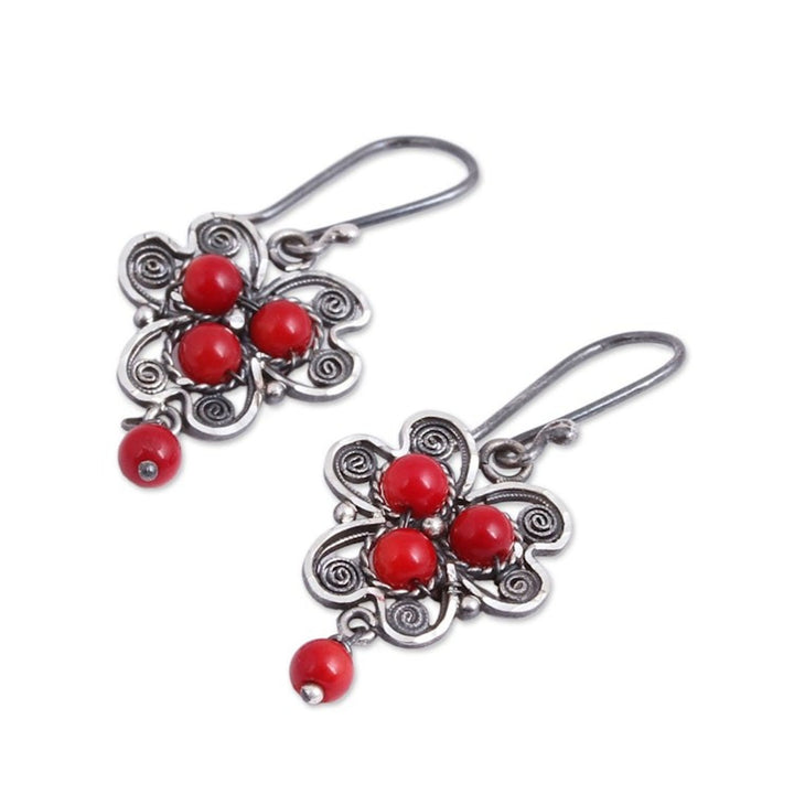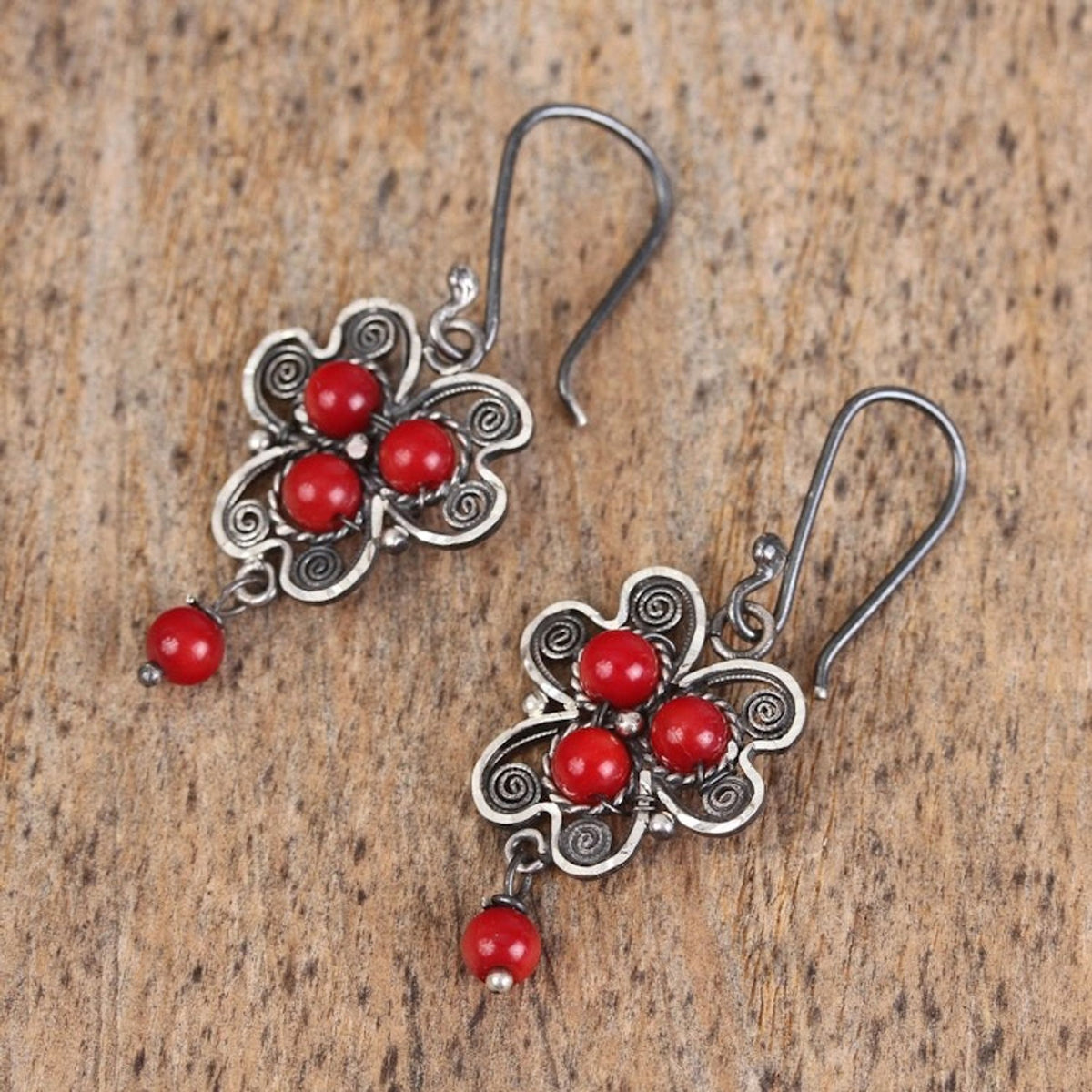 Sterling Silver Filigree Dangle Earrings with Red Glass Bead 'Red Succulence'