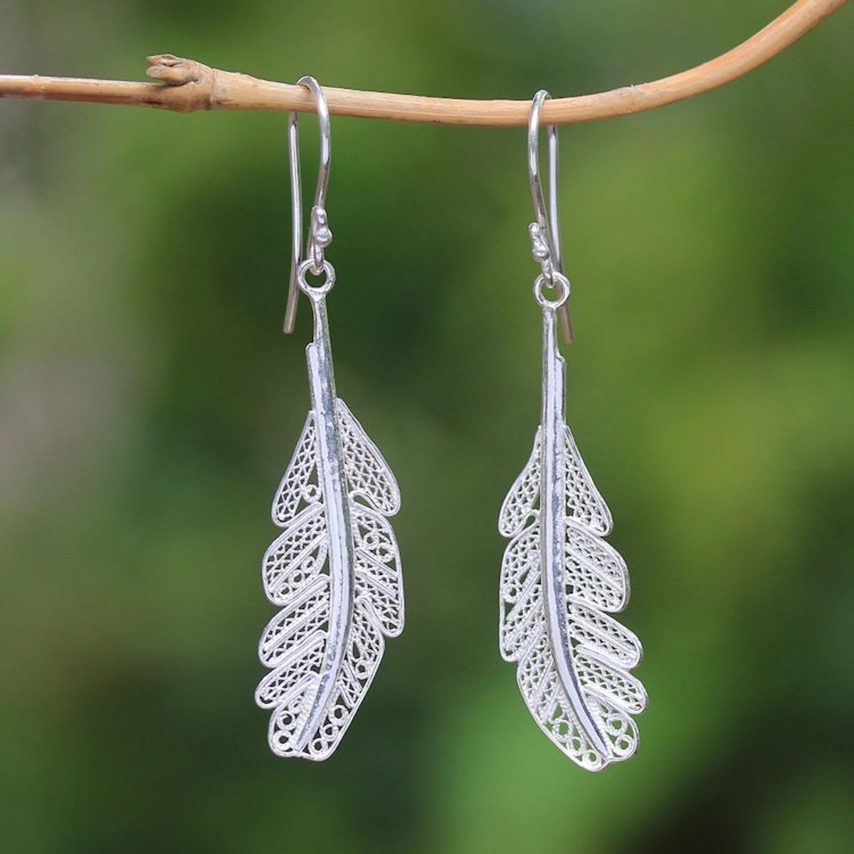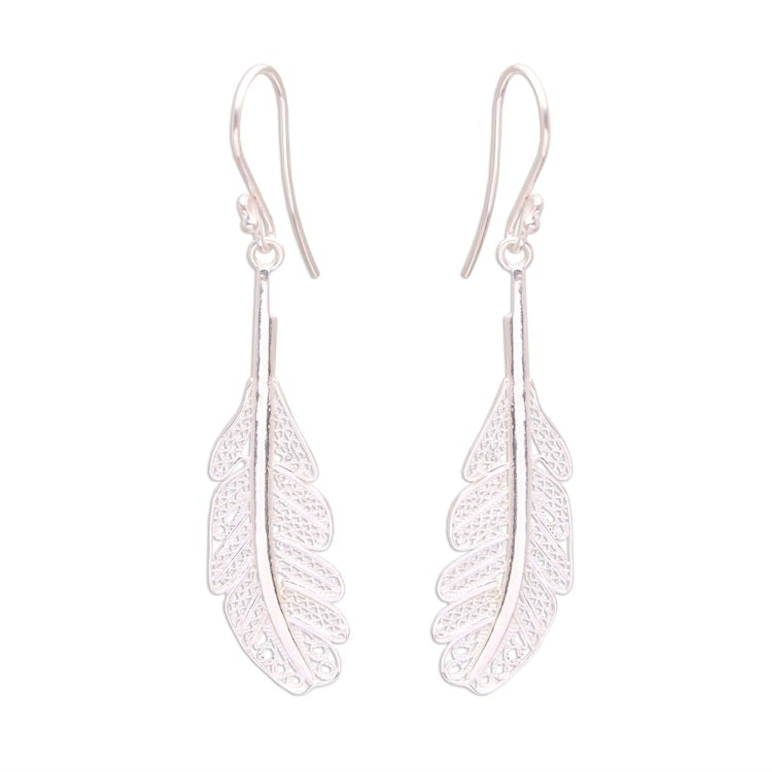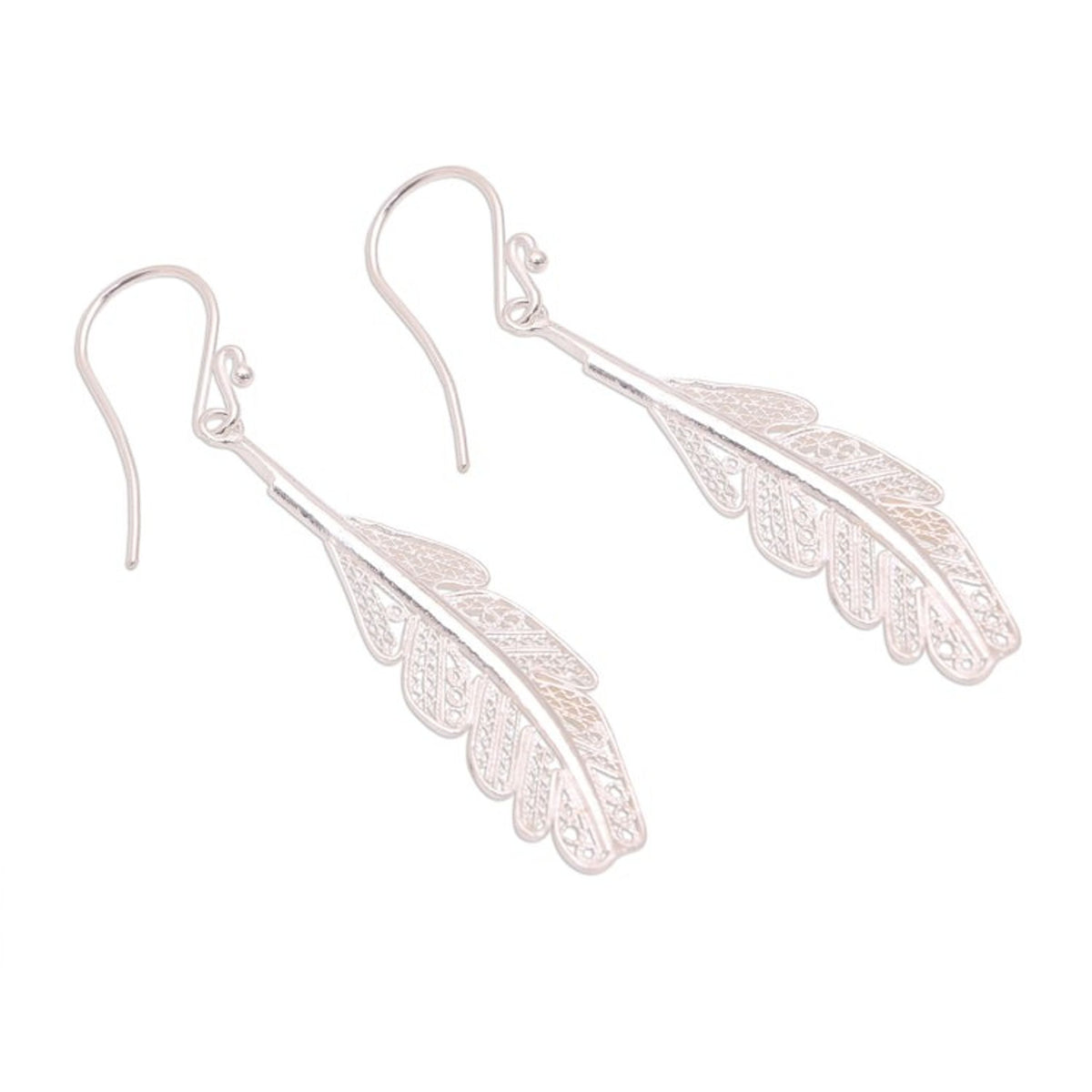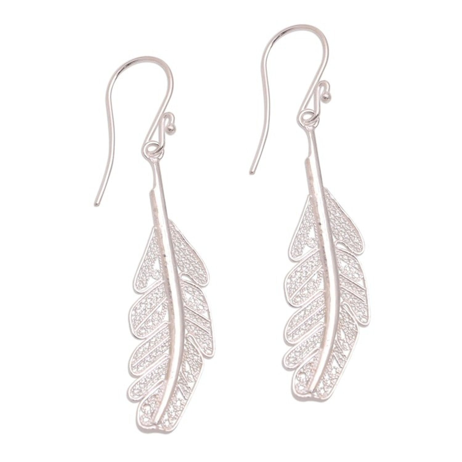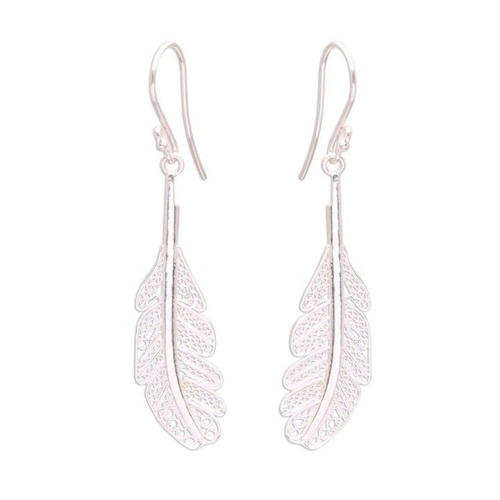 Sterling Silver Filigree Feather Dangle Earrings from Java 'Gleaming Feathers'