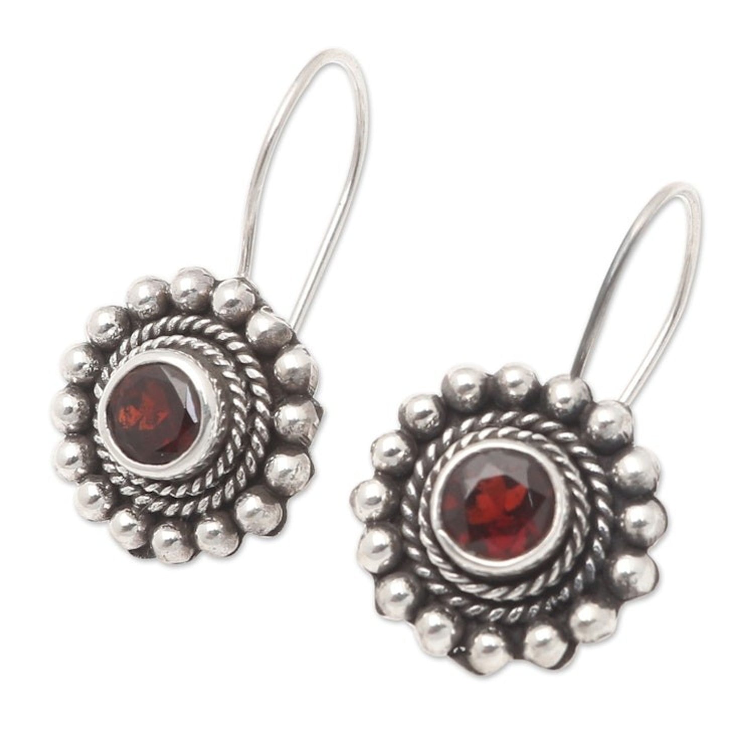 These 'Enchanting Flower in Red' floral drop earrings by Independent Artisans are a lovely and elegant accessory. Designed by Anya, these sterling silver earrings are centered with "garnet gemstones with an intense shade of red." They are surrounded by "sterling silver beads and wires with a unique combination finish." This piece is a way to "infuse Balinese tradition into fresh designs for a global audience."
