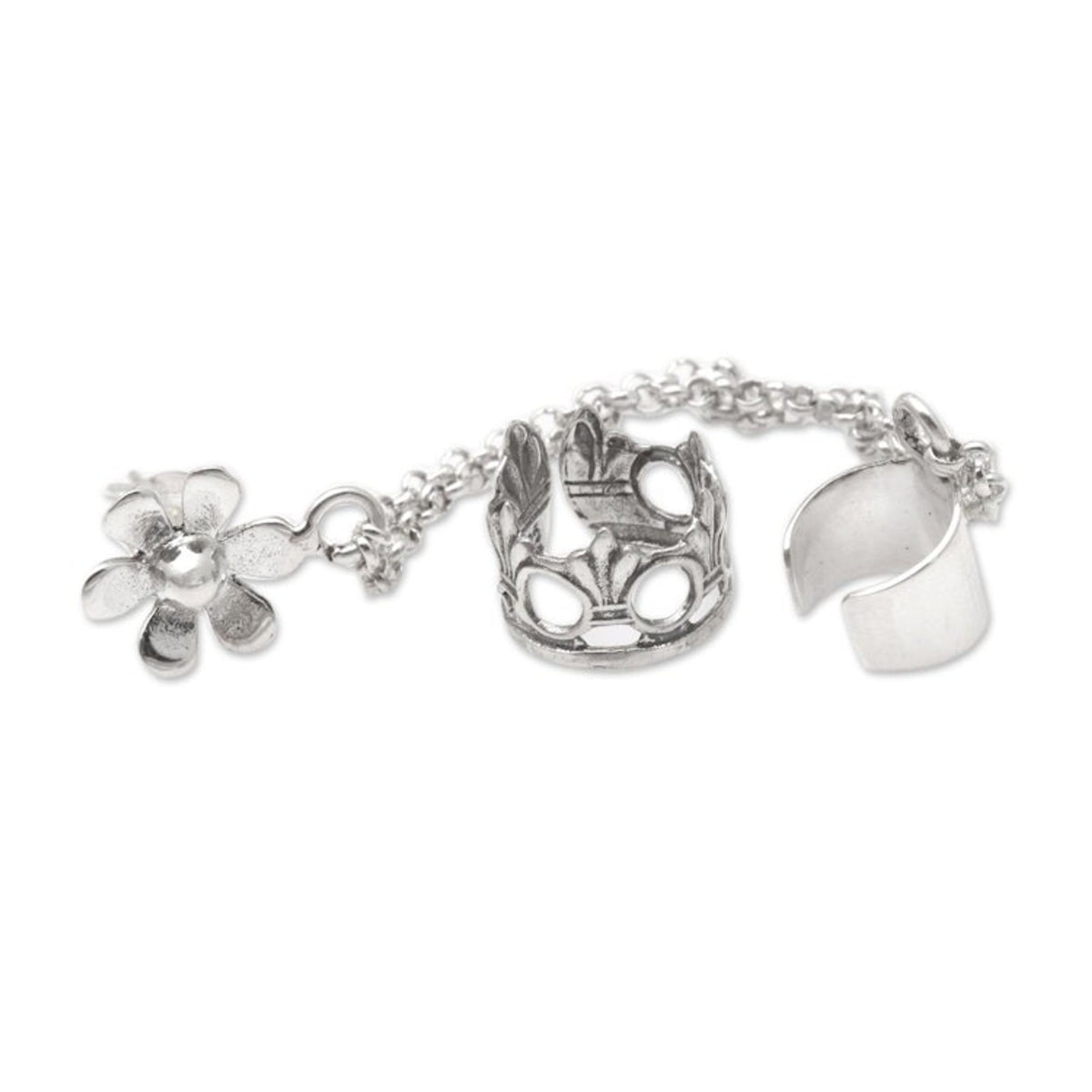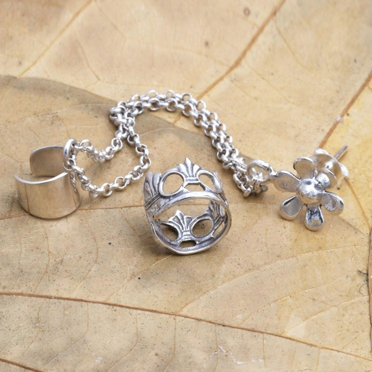 This 'Blossom Queen' floral themed ear cuff earrings pair by Independent Artisans is a lovely and regal accessory. Designed by Anya, this sterling silver set features one cuff that is shaped into a crown and is attached to a sterling silver chain that leads to a floral post earring. The other cuff is plain and polished. This piece is a way to "infuse Balinese tradition into fresh designs for a global audience."
