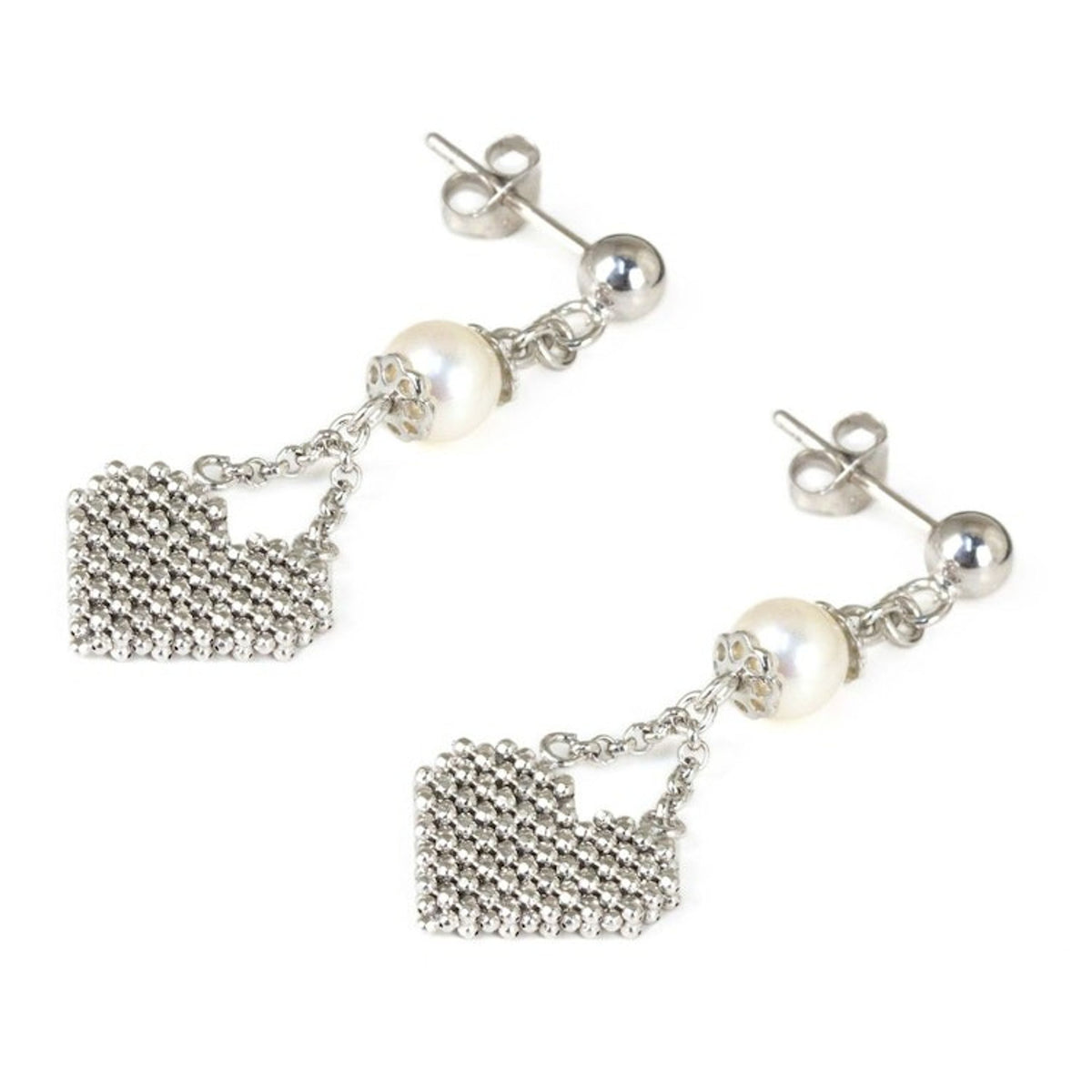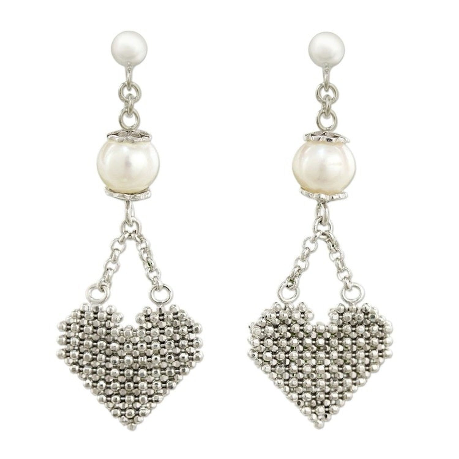 These 'Pure Heart' sterling silver heart earrings with pearls by Independent Artisans are a loving and elegant accessory. Designed by Angels, these sterling silver earrings feature "white iridescent pearls for a harmonious contrast." The high-polish finish adds a lovely shine. This piece is a way to continue the family legacy of crafting intricate silver chains.