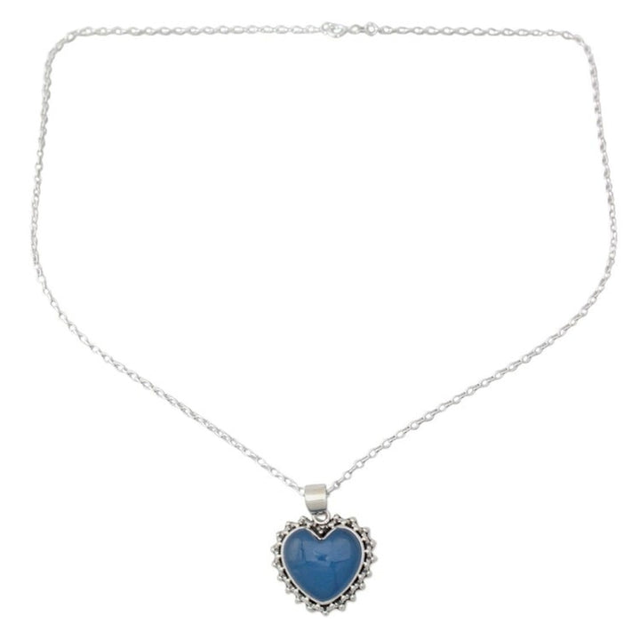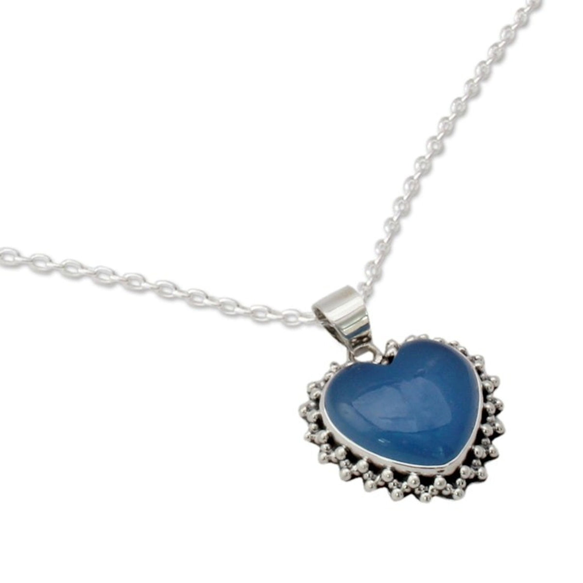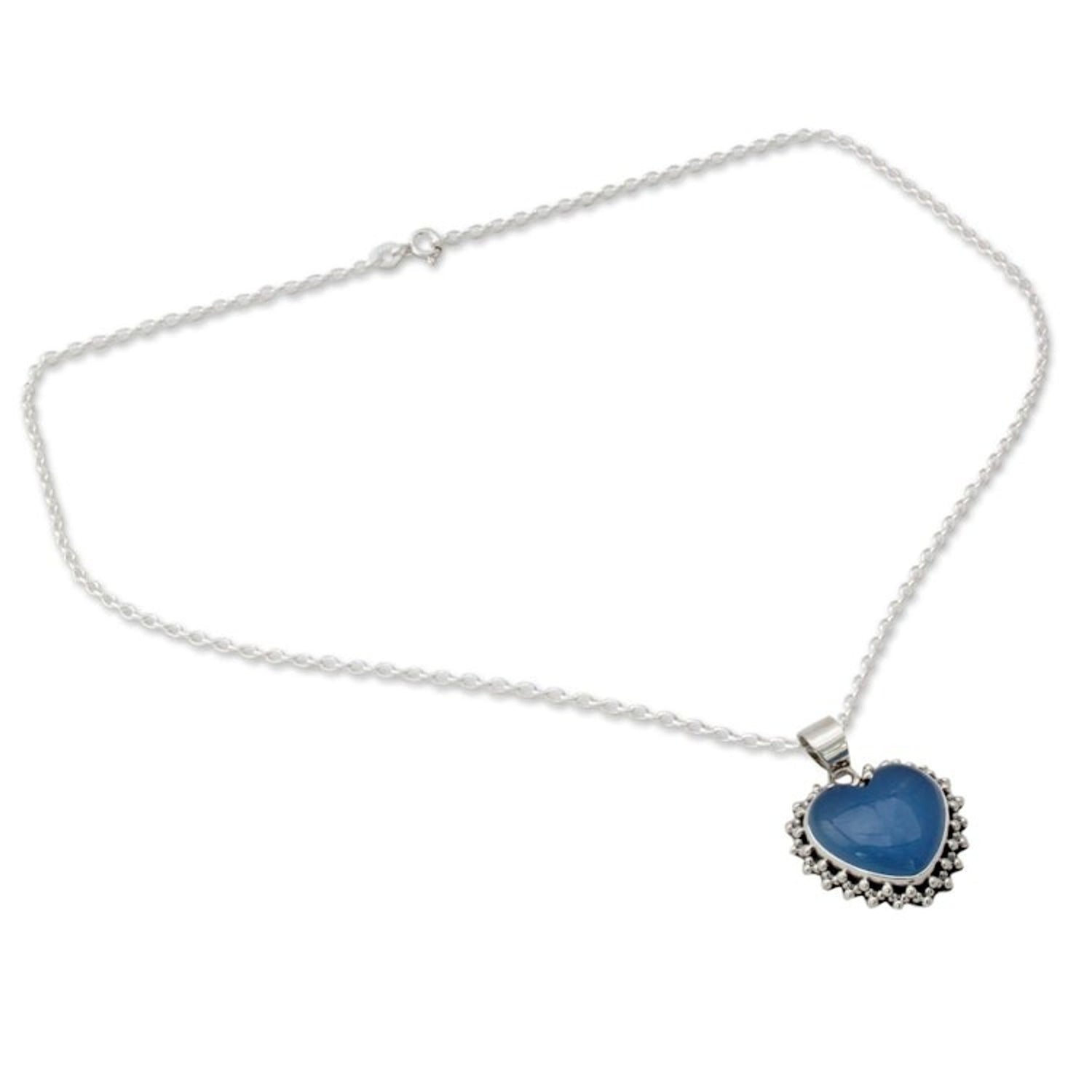 This 'Harmonious Heart' sterling silver heart necklace by Independent Artisans is a beautiful and spiritual accessory. Designed by Shanker, this sterling silver necklace features a heart with enhanced chalcedony, which is "believed to harmonize mind, body and spirit." This piece represents perseverance, tradition, and passion for his craft.