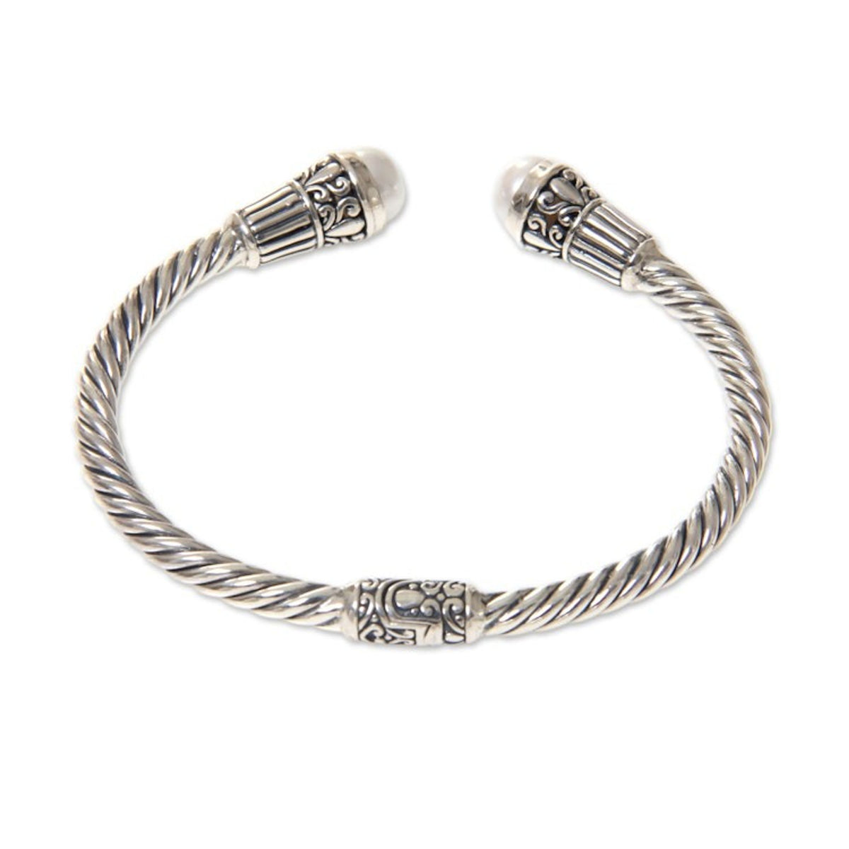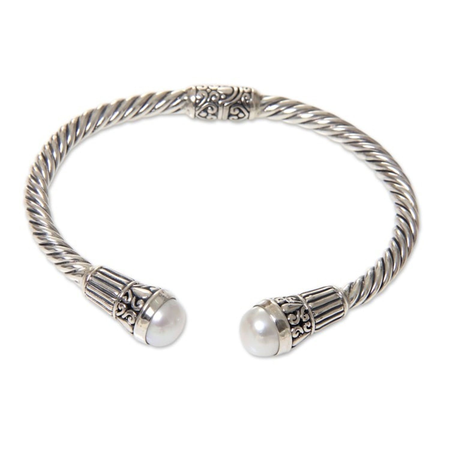 This 'Moonlit Promenade' sterling silver hinged cuff bracelet with pearls by Independent Artisans is an extraordinary and beautiful accessory. Designed by Wayan Neri, this sterling silver cuff bracelet features "silvery white pearls" and an "ornate hinge." This piece is a way to blend traditional Balinese motifs with modern aesthetics.