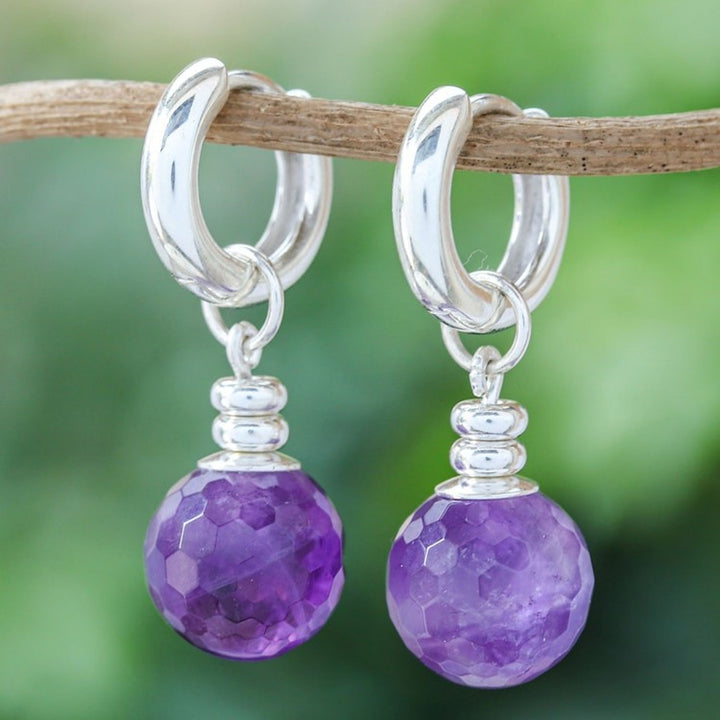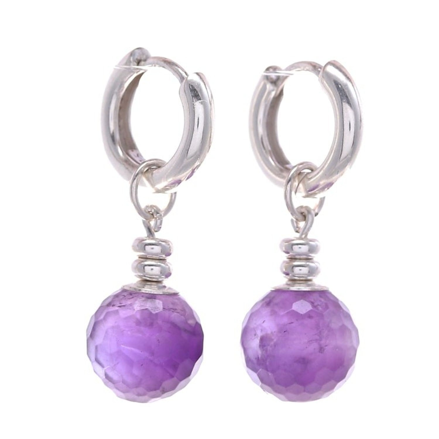 Sterling Silver Hoop Earrings with Dangling Amethyst Stones 'Shining Splendor'