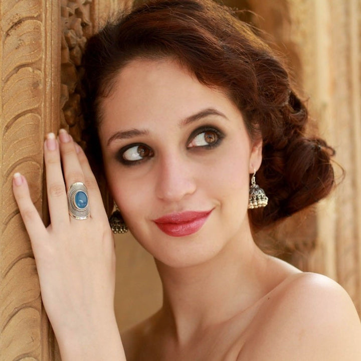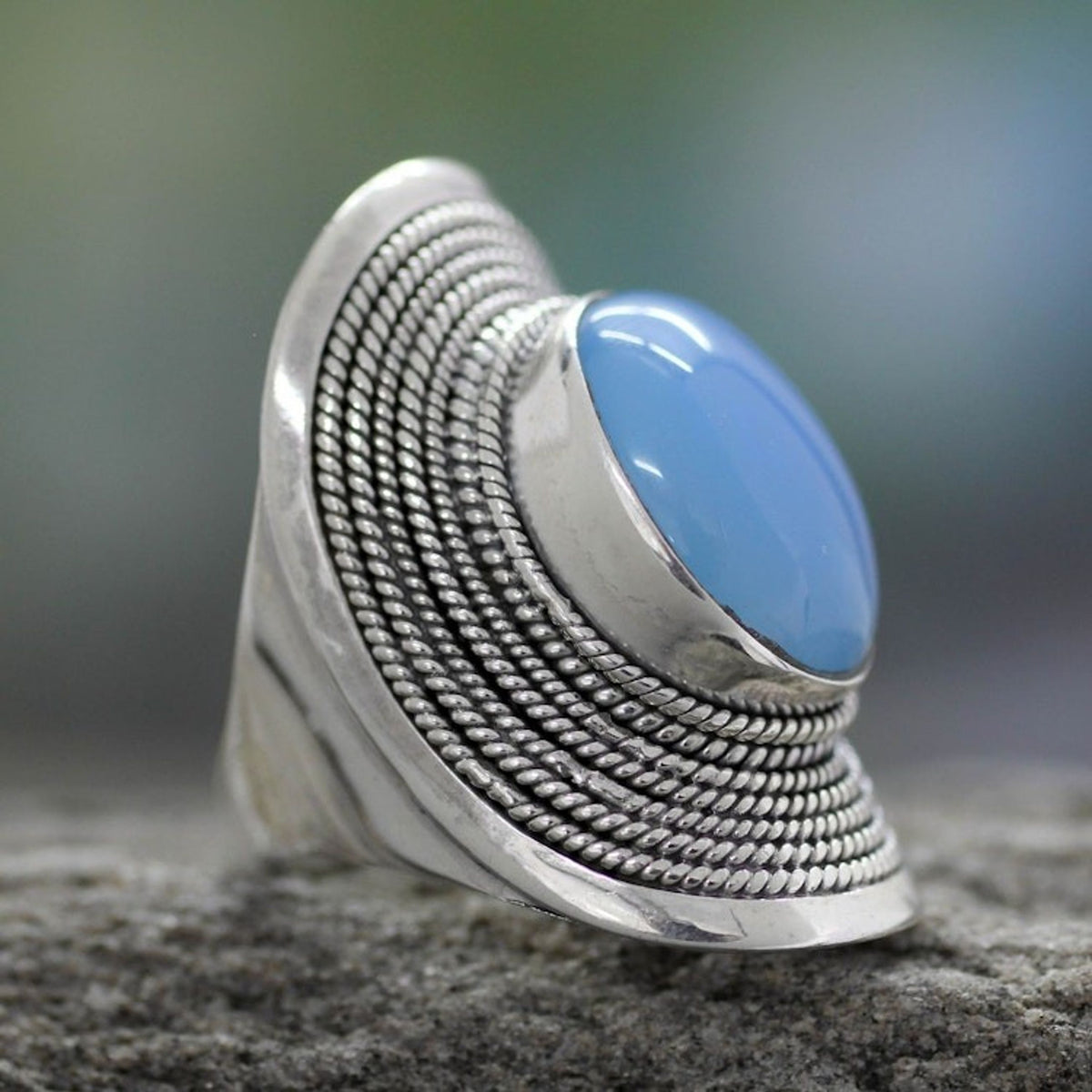 This 'Jaipur Skies' sterling silver jewelry chalcedony ring from India by Independent Artisans is a captivating and elegant accessory. Designed by Shanker, this sterling silver ring features a "dyed cabochon gem" of chalcedony that is "surrounded by ornate sterling silver." This piece represents perseverance, tradition, and passion for his craft.