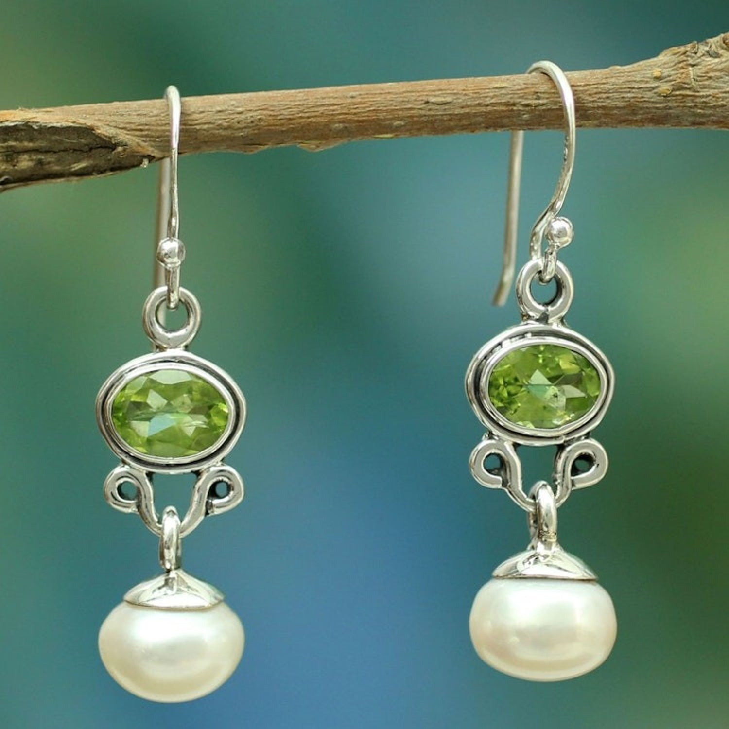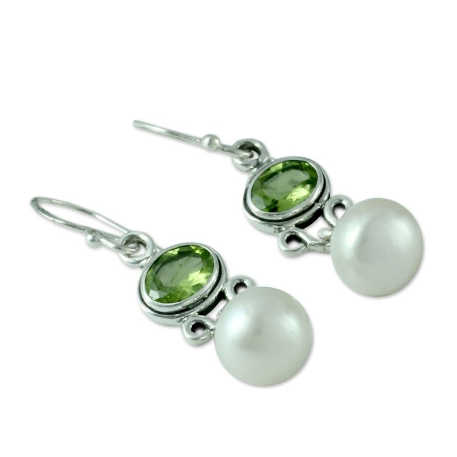 These 'Verdant Light' sterling silver jewelry pearl and peridot earrings by Independent Artisans are a luminous and beautiful accessory. Designed by Shanker, these sterling silver earrings feature "pearl" and "peridot" that total 12.5 carats. The high-polish finish adds a lovely shine. This piece represents perseverance, tradition, and passion for his craft.