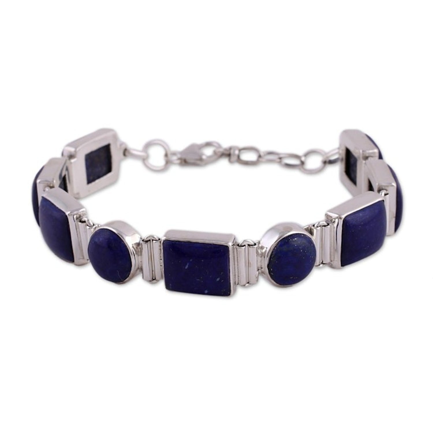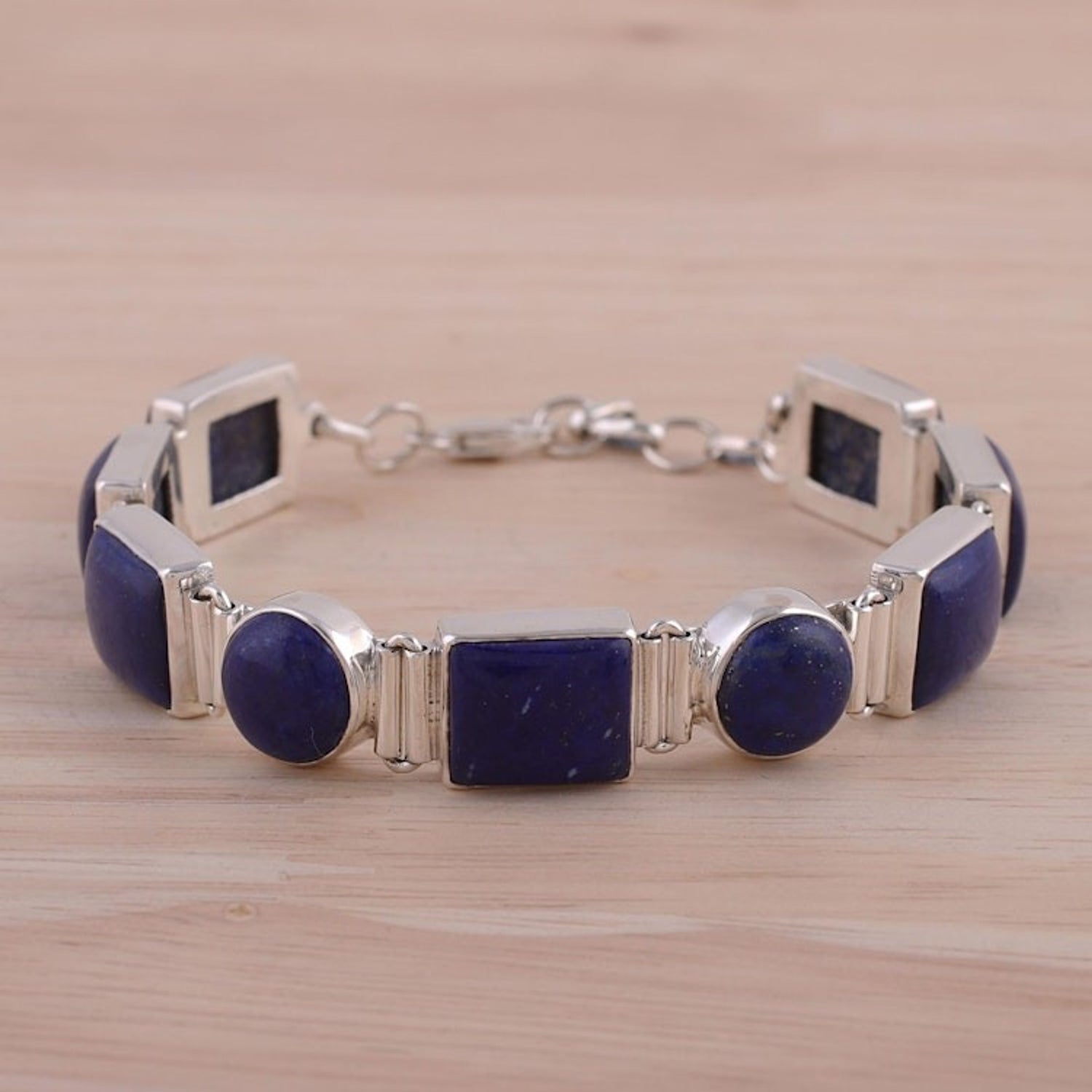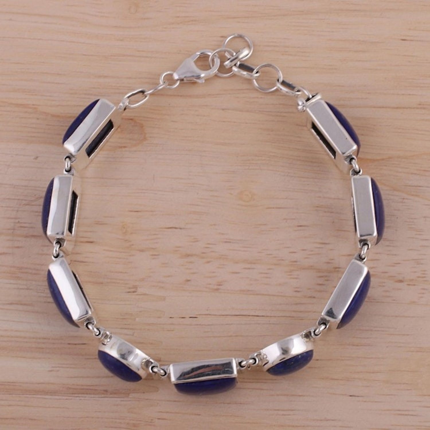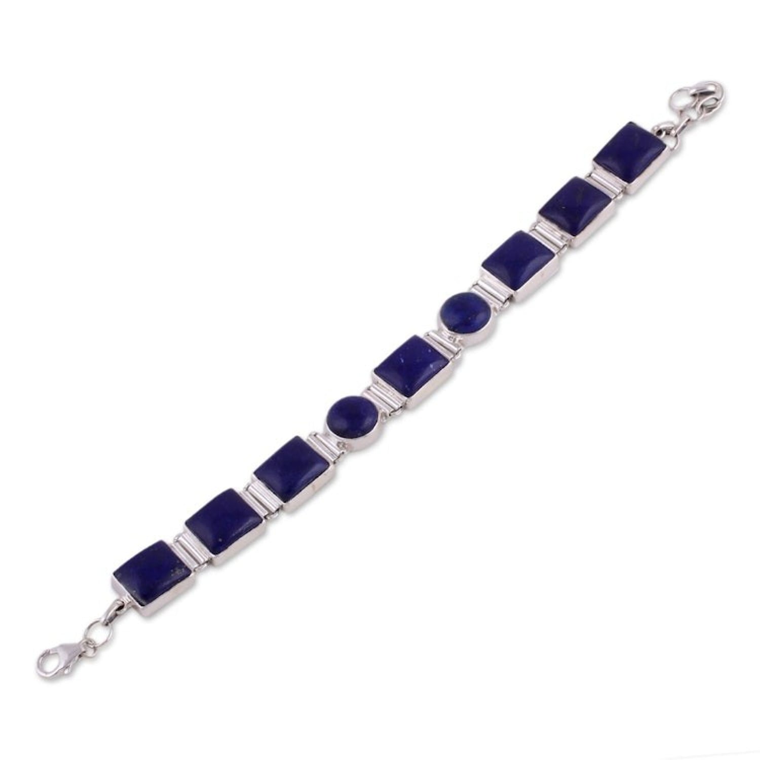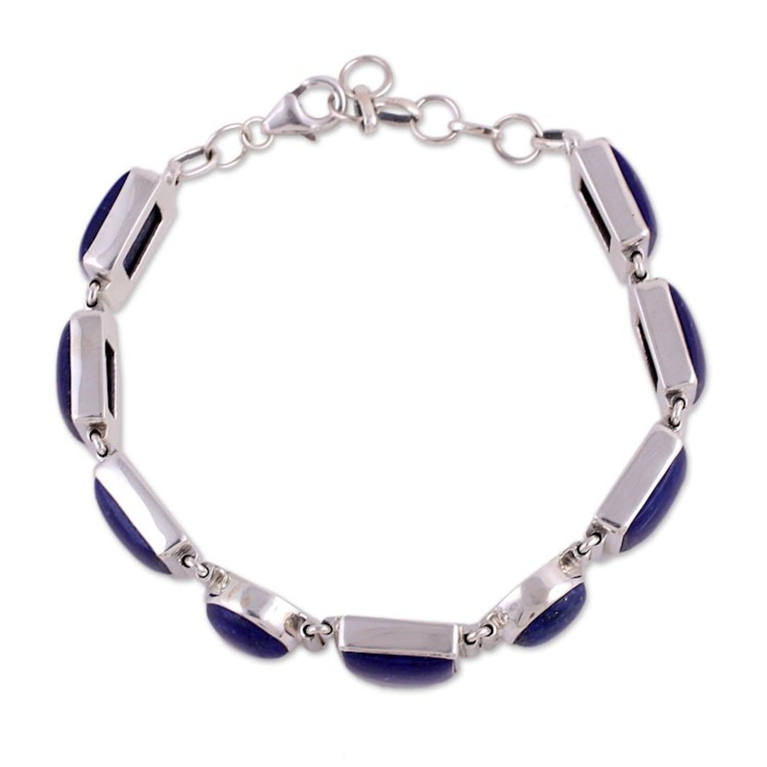 This 'Connected' sterling silver lapis lazuli bracelet Indian jewelry by Independent Artisans is a beautiful and meaningful accessory. Designed by Shanker, this sterling silver bracelet features "two blue moons" that are linked with "lapis lazuli squares." This piece represents perseverance, tradition, and passion for his craft.