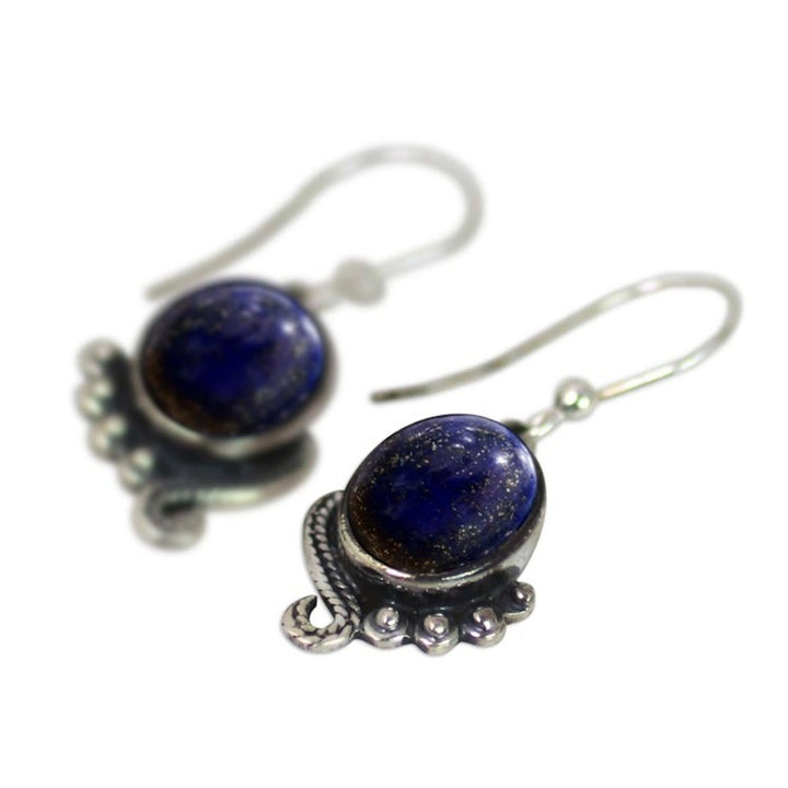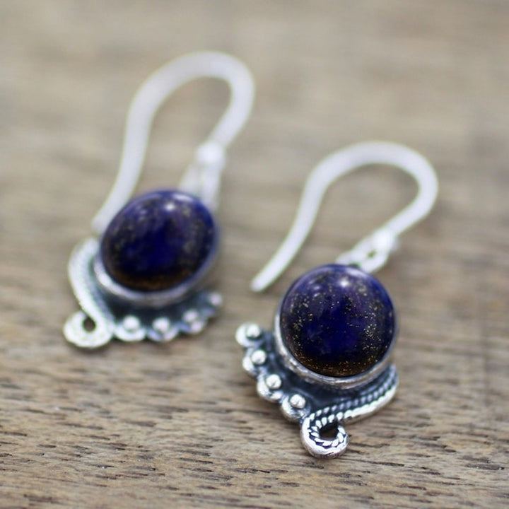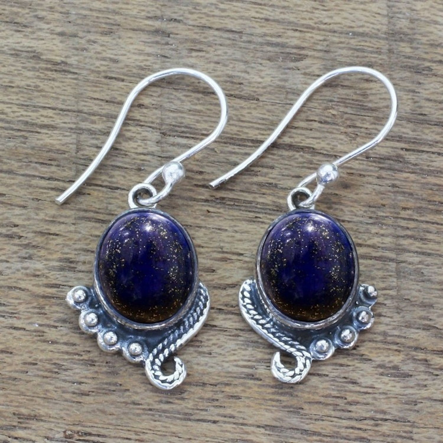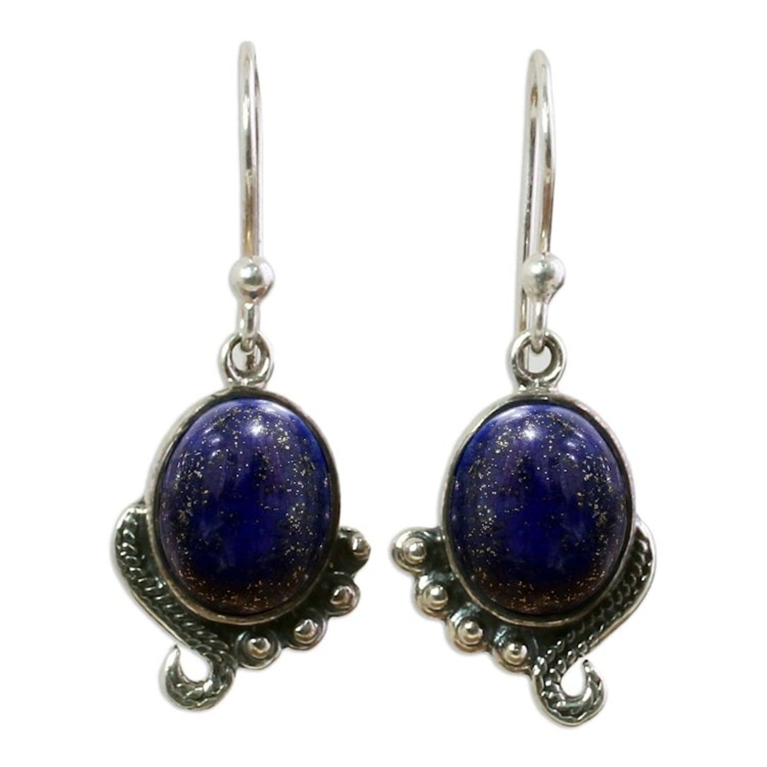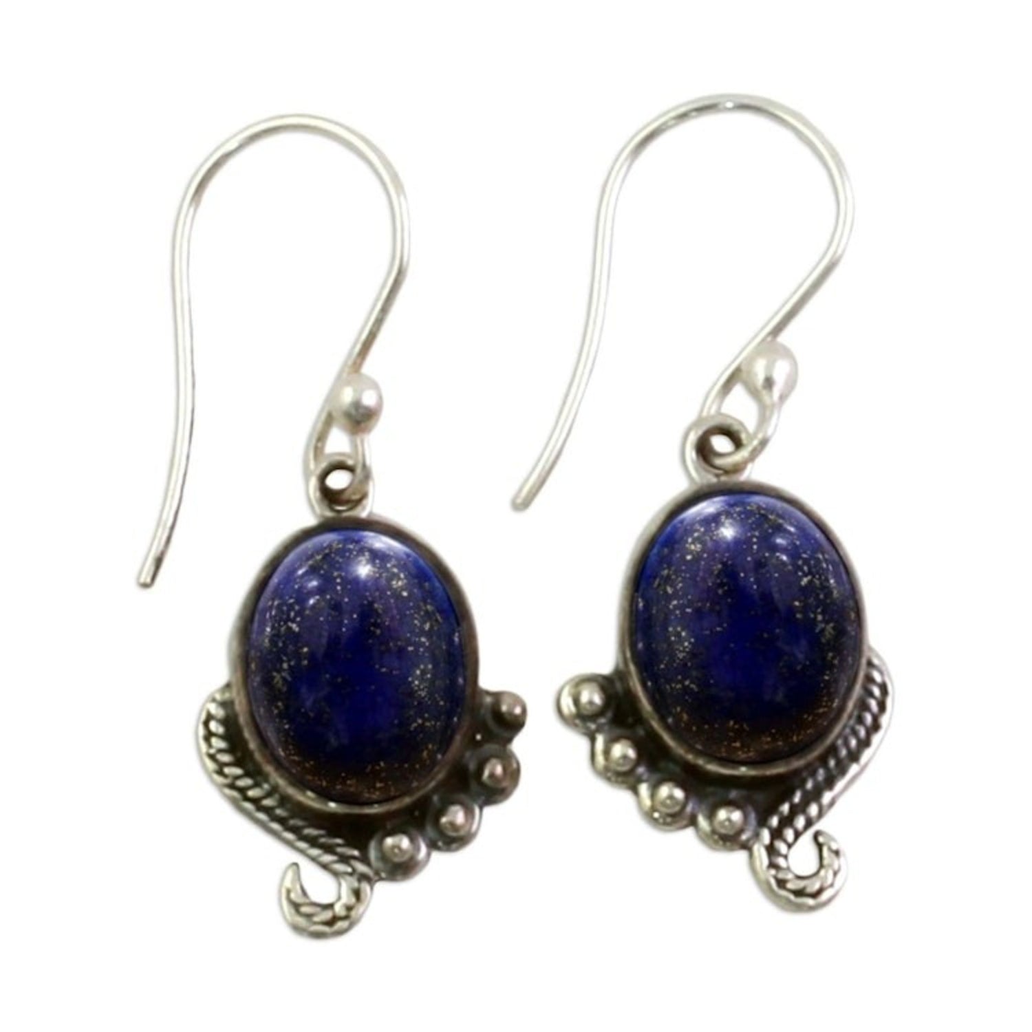 Sterling Silver Lapis Lazuli Dangle Earrings from India 'Indian Delight in Blue' These 'Indian Delight in Blue' earrings by Independent Artisans showcase Shanker's inspiring journey and dedication to his craft. Featuring elegant oval-shaped lapis lazuli stones, these dangle earrings are a celebration of artistry and heritage. The stones are meticulously framed by handcrafted rope and dot motifs in sterling silver, a design that evokes traditional Indian elegance while remaining beautifully contemporary. This pair is more than just an accessory; it's a symbol of forging one's own path and a delightful expression of personal style. The detailed craftsmanship and thoughtful design make these a perfect addition for anyone looking to wear a piece with a story.