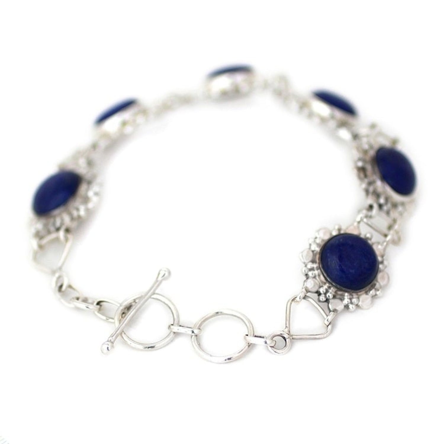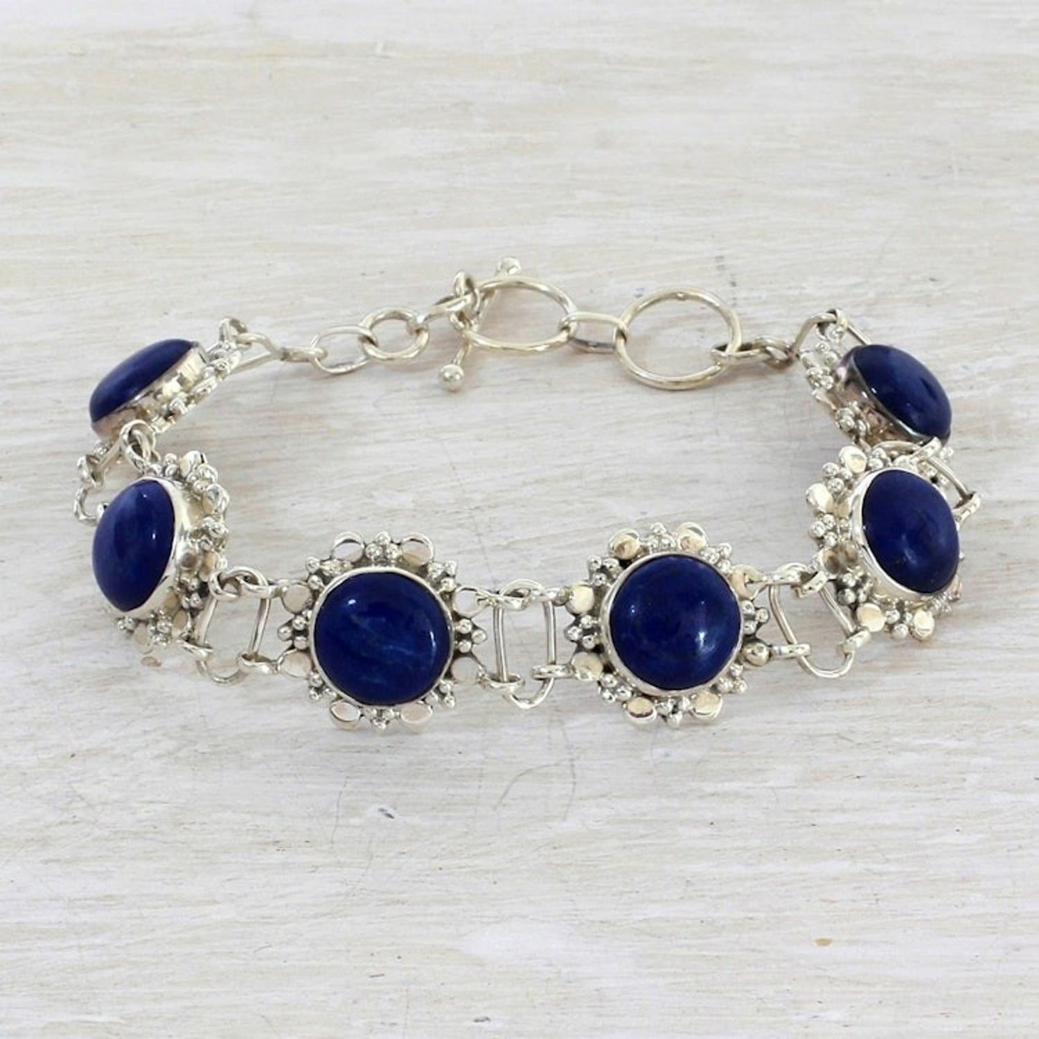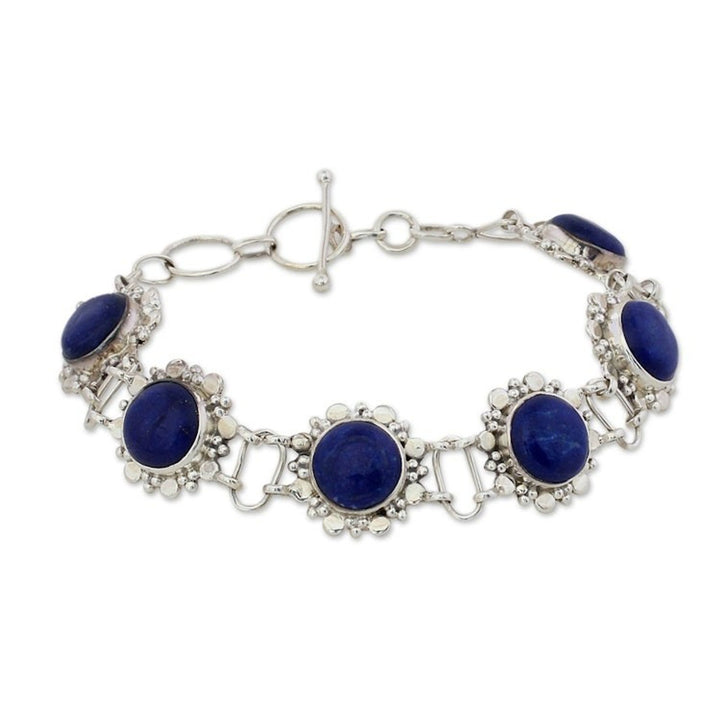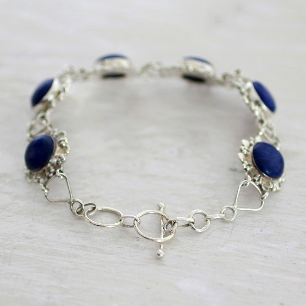 Sterling Silver Lapis Lazuli Link Bracelet from India 'Nighttime Glamour' This 'Nighttime Glamour' bracelet by Independent Artisans is a stunning piece from designer Shanker, who collaborates with local artisans to create beautiful jewelry that tells a story of perseverance and passion. Featuring round lapis lazuli stones set within a handcrafted sterling silver link design, this bracelet captures the serene and sophisticated glamour of a starlit night. The high polish finish highlights the rich blue of the lapis, making it a captivating and elegant accessory. This piece is perfect for those who want to add a touch of subtle drama and luxurious artistry to their collection.