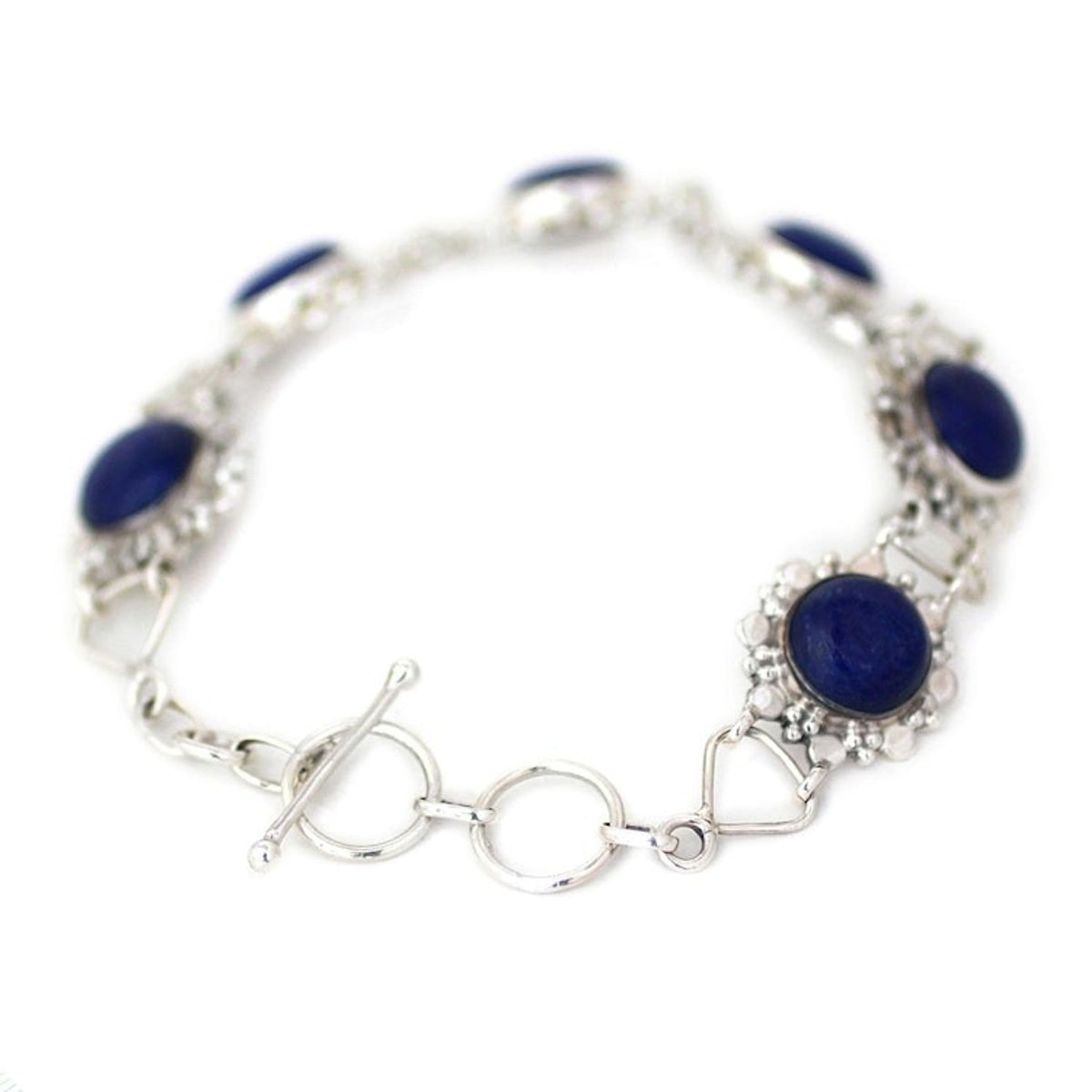 Handcrafted in 925 sterling silver with dyed lapis lazuli, this bracelet measures 7.8 inches L x 0.6 inches W and weighs 0.63 oz. It features a high polish finish and a toggle clasp.