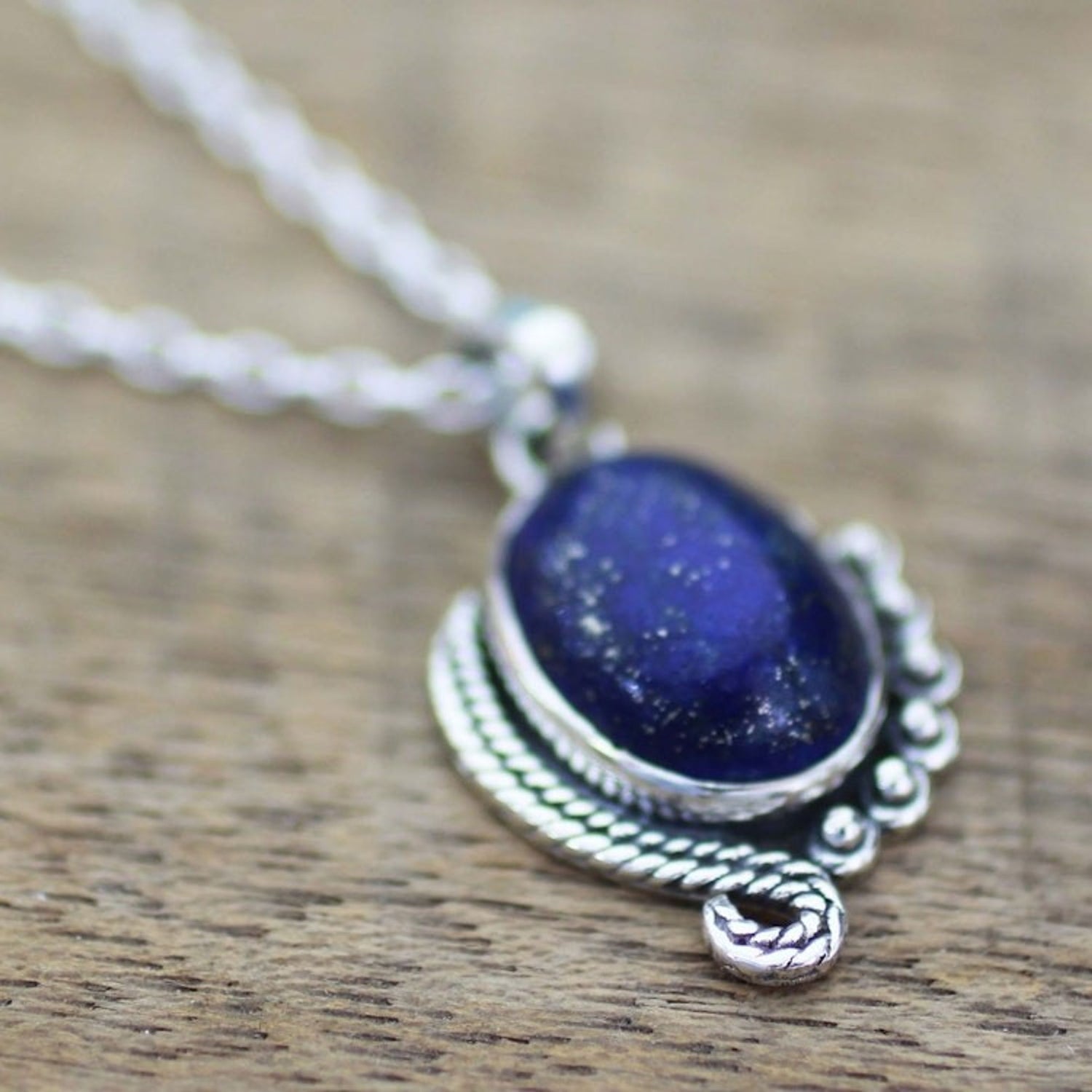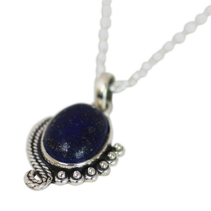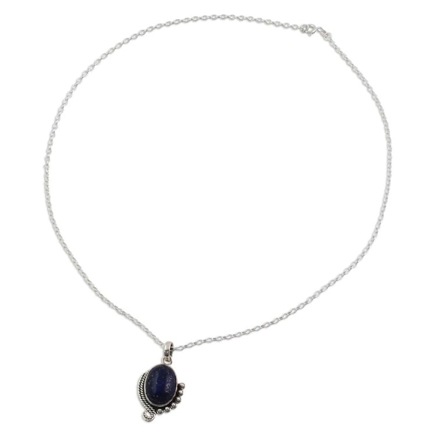 Sterling Silver Lapis Lazuli Pendant Necklace from India 'Indian Delight in Blue' This 'Indian Delight in Blue' necklace by Independent Artisans is a truly delightful piece that showcases the remarkable journey of designer Shanker. The single, oval-shaped lapis lazuli cabochon is the centerpiece, its rich blue hue a symbol of the beauty and resilience found in his craft. Surrounding the stone are delicate, handcrafted rope and dot motifs in sterling silver, a design that pays homage to traditional Indian artistry while offering a timeless elegance. This pendant is a meaningful adornment, representing the successful path of a passionate artisan who chose to create beauty for the world.