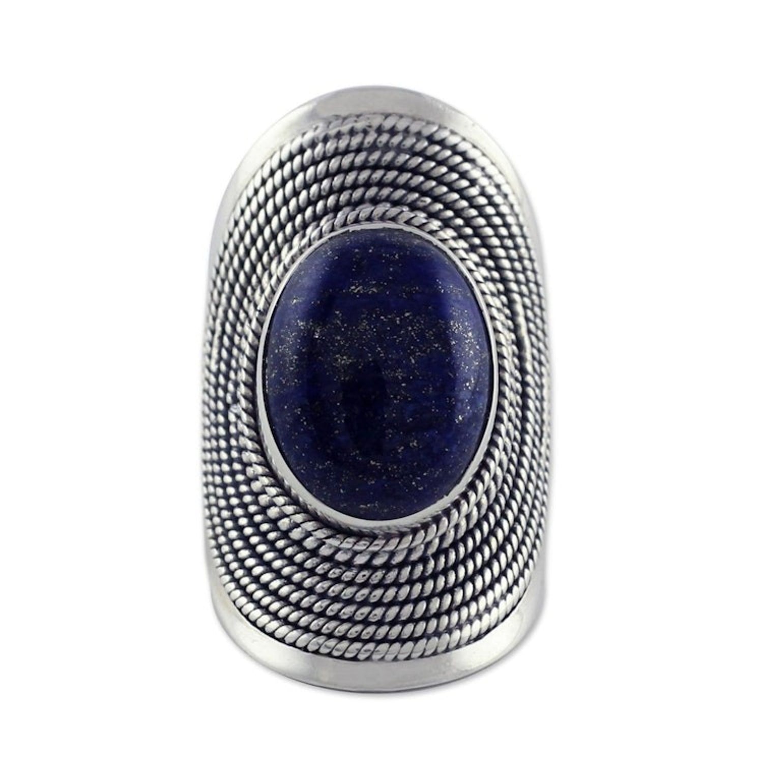 Sterling Silver Lapis Lazuli Ring from India 'Jaipur Blue' This 'Jaipur Blue' ring by Independent Artisans is a captivating piece that brings the vibrant blue of lapis lazuli to life. Designer Shanker's journey is an inspiration, and his dedication to his craft is evident in the ornate sterling silver design that surrounds the cabochon gem. The rich, gold-flecked blue of the stone is a true statement, and the full-finger design makes this ring a bold and beautiful accessory. As the birthstone for September, it carries a special symbolic meaning, making it an ideal gift or a personal treasure. This ring is a testament to the artistry and passion that define Shanker's work.