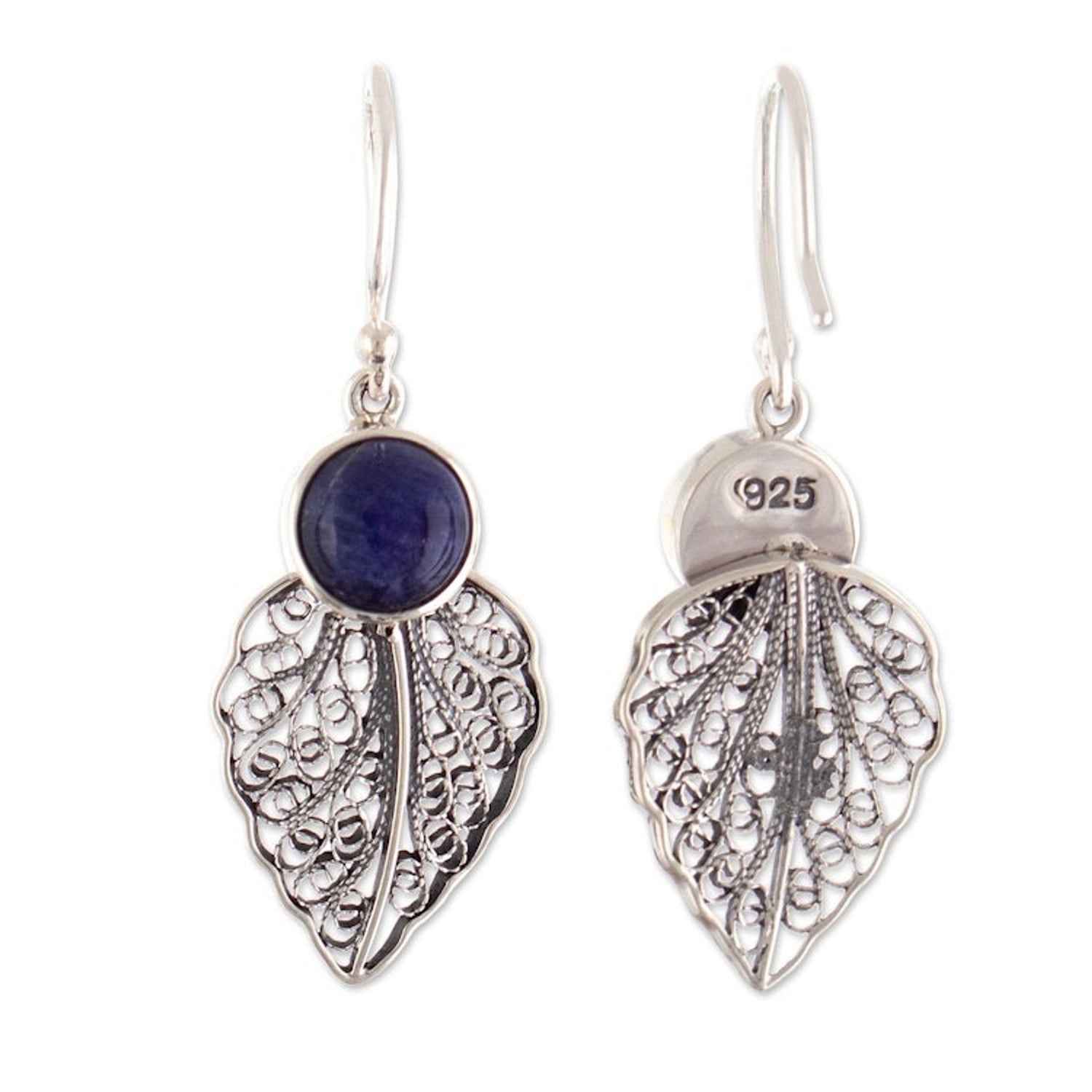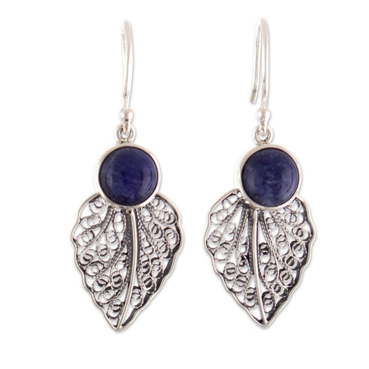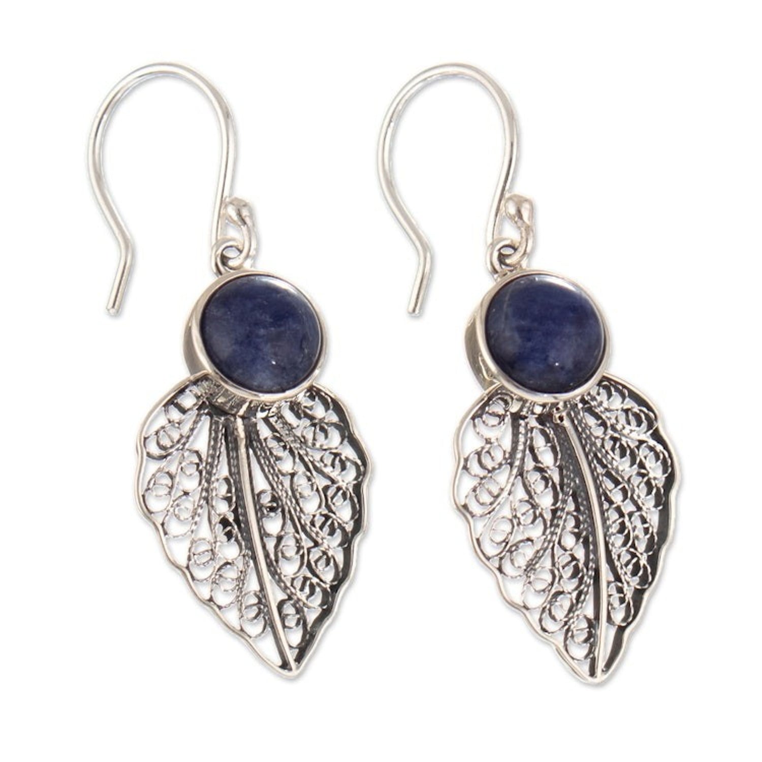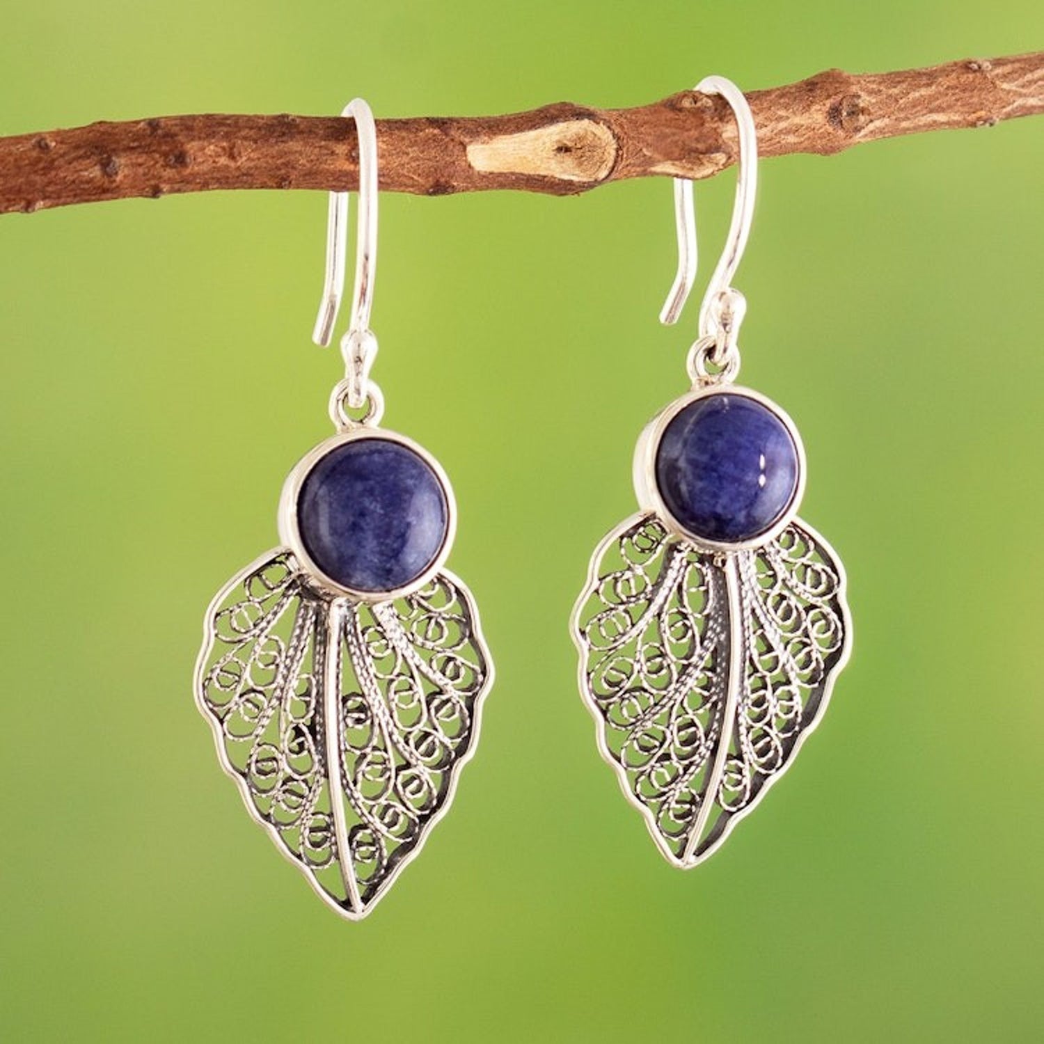 Sterling Silver Leaf Filigree Dangle Earrings with Sodalite 'Leaf in the Wind' These 'Leaf in the Wind' earrings by Independent Artisans are a phenomenal statement piece from the Paola Siza workshop in Peru. Influenced by the captivating allure of nature, the designers have created a graceful piece featuring delicate, intricate filigree work that gives the sterling silver leaves a lace-like texture. The gorgeous round sodalite gemstones beautifully crown the design, their rich blue hue adding an extra touch of artistry. The oxidized finish emphasizes the detailed filigree, making these earrings a celebration of Peruvian heritage and a testament to the family's dedication to their craft.