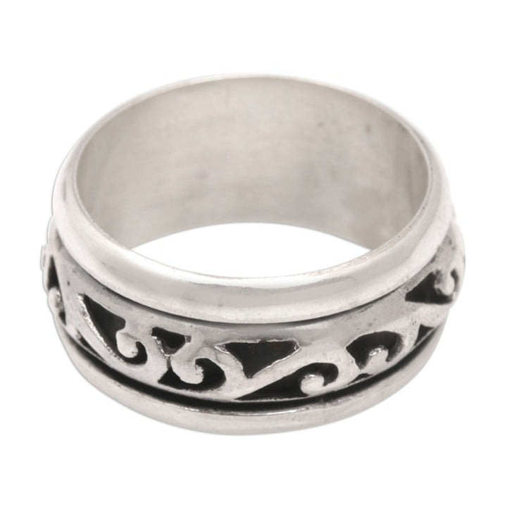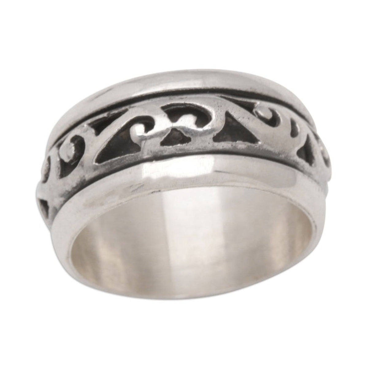 Sterling Silver Meditation Ring with Sinuous Details 'Spinning Waves' This 'Spinning Waves' meditation ring by Independent Artisans is an innovative and beautiful piece from Balinese designer Made Suyana. Inspired by Bali’s ocean and waves, the ring features a sturdy structure with a middle hoop embellished with sinuous formations. The ring is a testament to Made's skill and perseverance, blending Balinese heritage with contemporary influences. It's a tactile and visually soothing accessory, perfect for moments of reflection and inner calm.