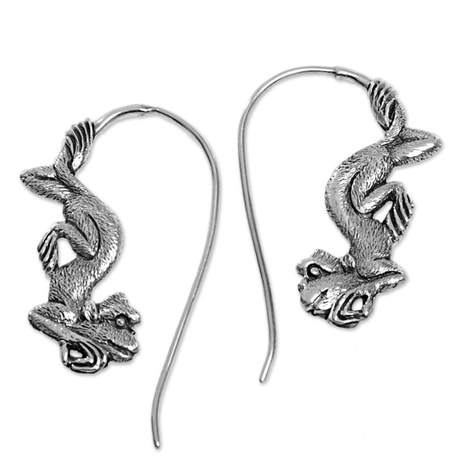 Sterling Silver Monkey Drop Earrings from Indonesia 'Reposing Monkey'