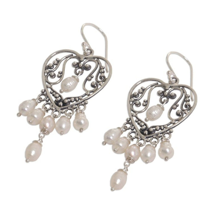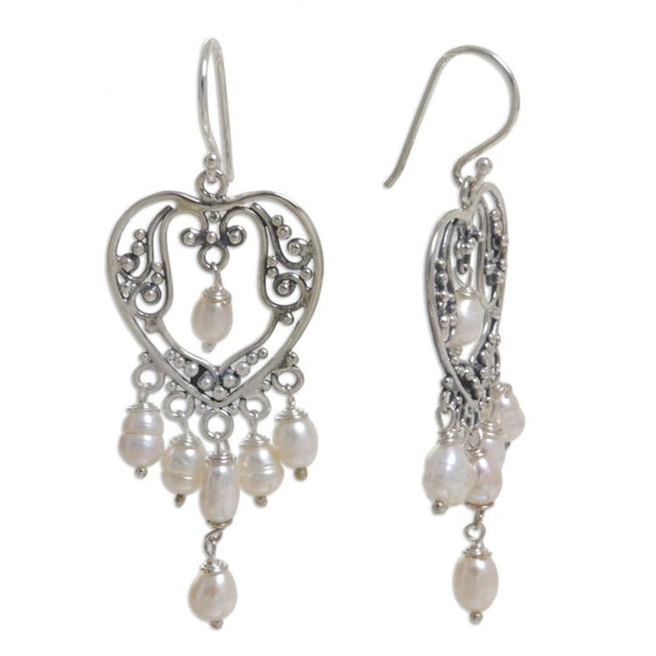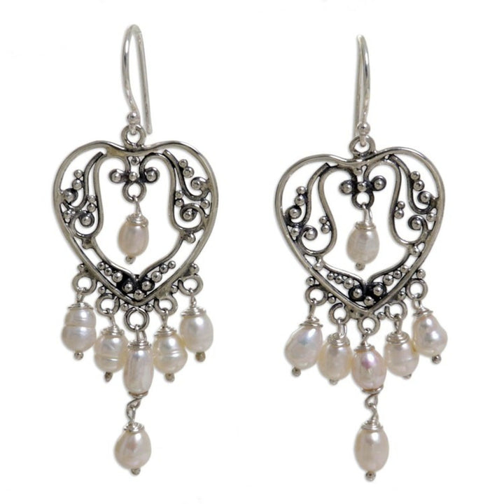Sterling Silver Pearl Chandelier Earrings 'Heart Symphony' These 'Heart Symphony' chandelier earrings by Independent Artisans are an opulent and exquisite piece from Balinese artisan Nyoman Rena. The earrings evoke all the nuances of a symphony in sterling silver, adorned with shimmering freshwater pearls. This design reflects Rena's distinctive style, which blends his carving skills with metalwork, capturing both Balinese heritage and contemporary design. These earrings are a perfect example of his art and his dedication to his craft.