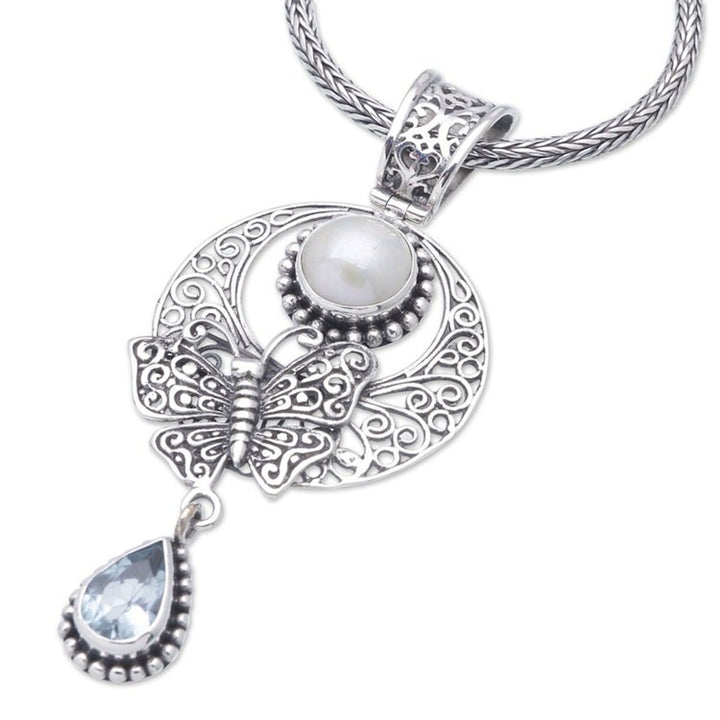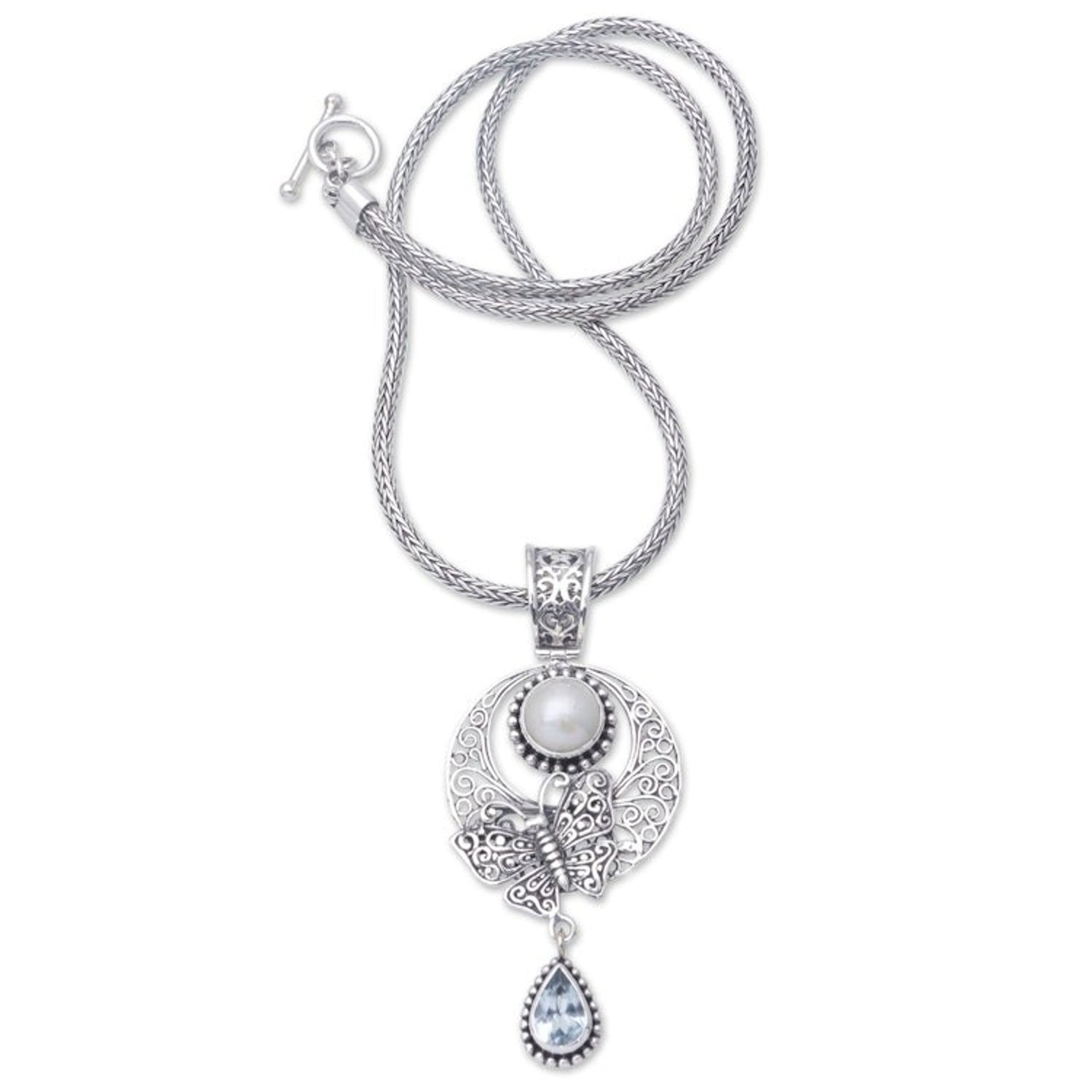 Sterling Silver Pendant Necklace with Blue Topaz and Pearl 'Blue Butterfly Teardrop' This 'Blue Butterfly Teardrop' pendant necklace by Independent Artisans is a magical and stunning creation from Balinese artisan Anya. The necklace features a grey cultured pearl as the centerpiece, along with a faceted two-carat blue topaz stone. A luminous butterfly symbolizes transformation, beauty, and hope, adding a special meaning to this magical creation. This design beautifully blends simplicity, animal motifs, and traditional Balinese designs to resonate with people across generations.