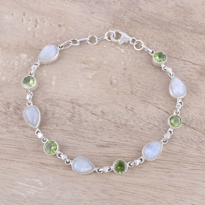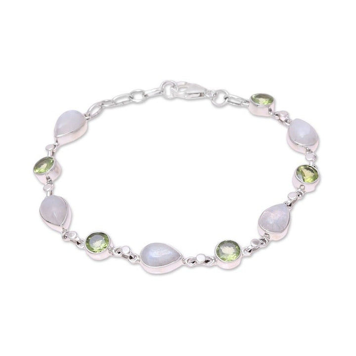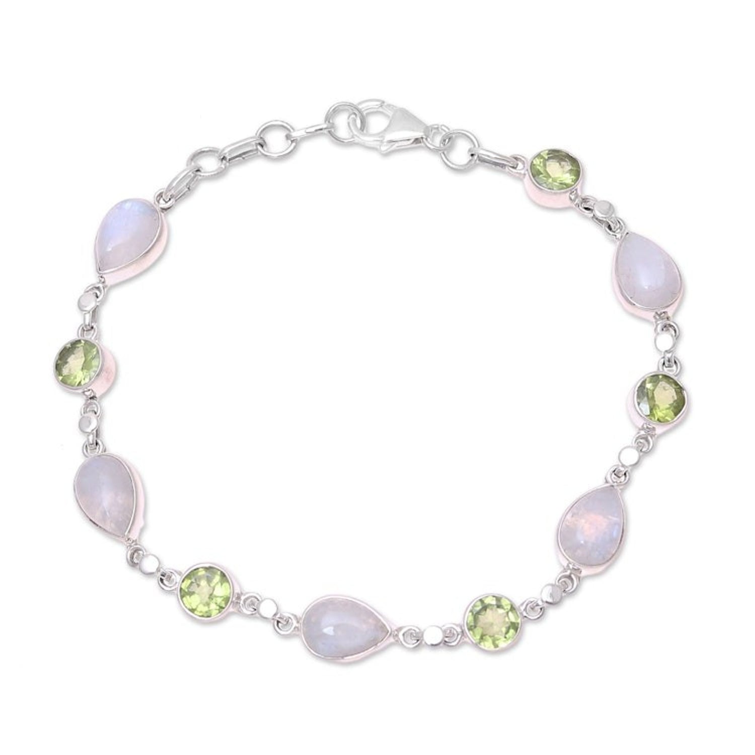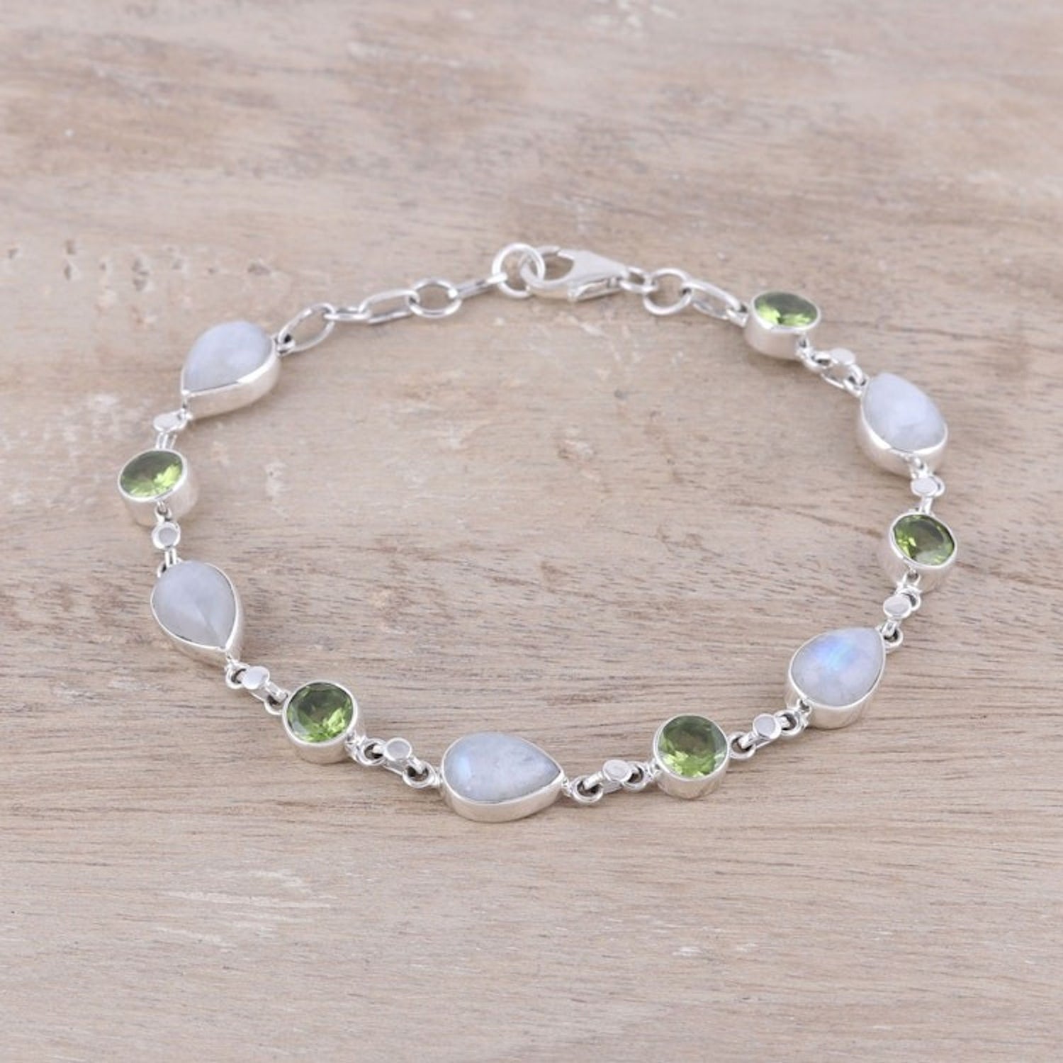 Sterling Silver Rainbow Moonstone and Peridot Link Bracelet 'Misty Forest'