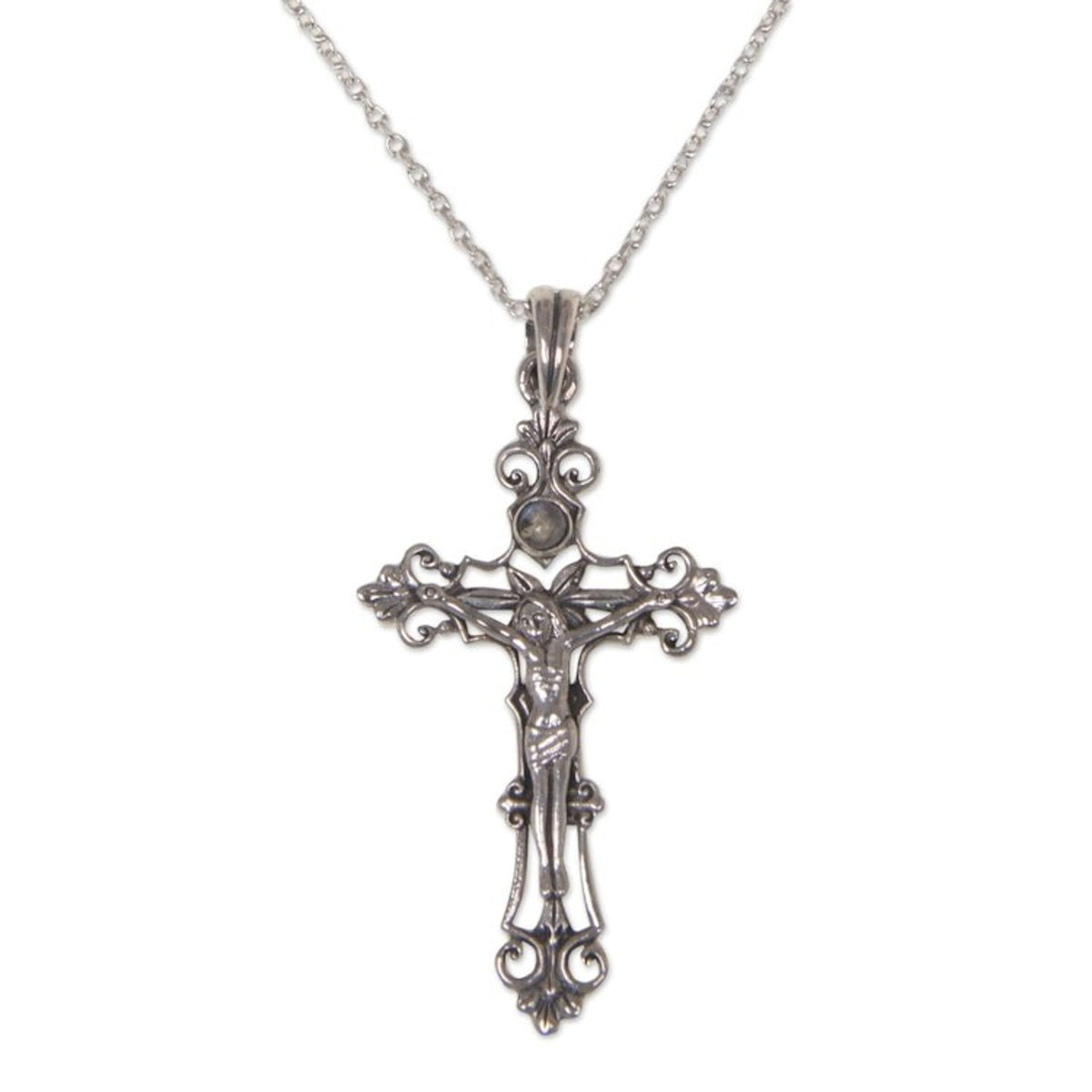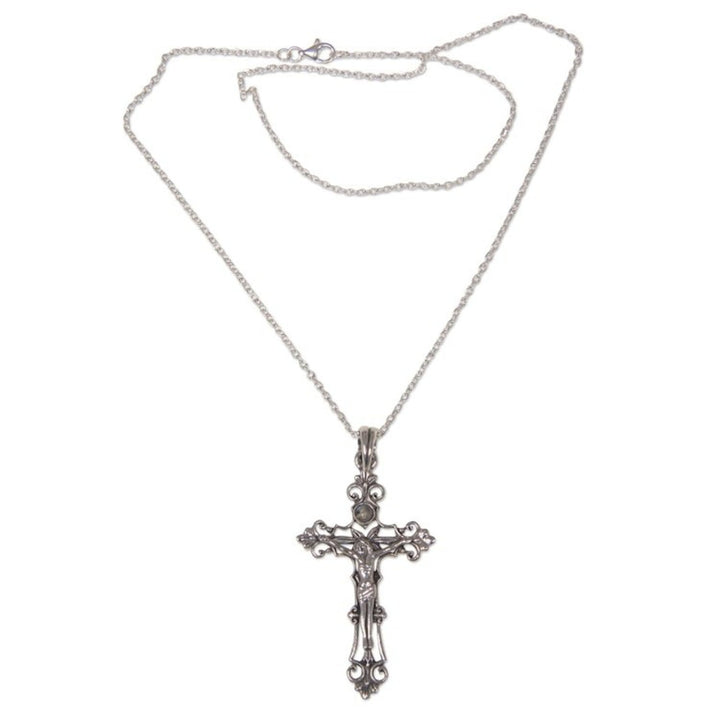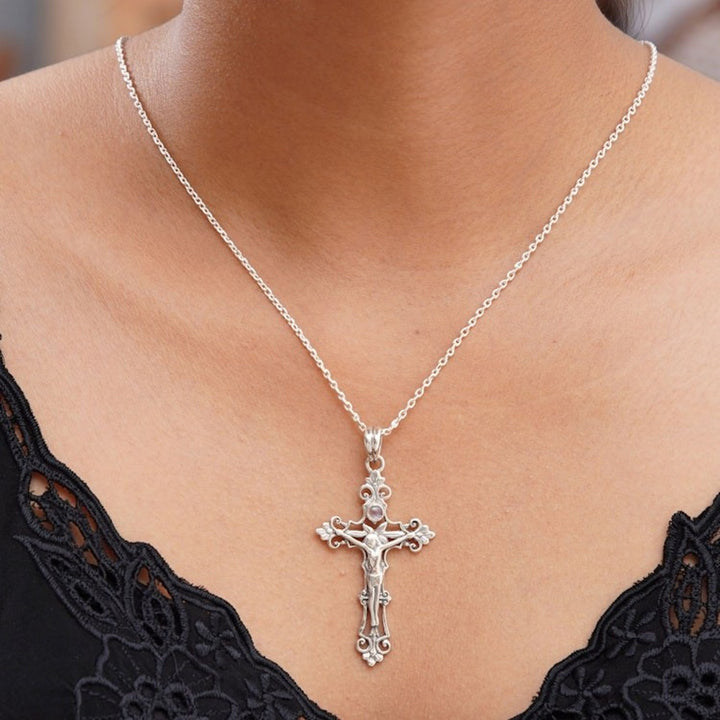 This Sterling Silver Rainbow Moonstone Cross Necklace by Rena is an exquisite piece that beautifully combines classic spiritual symbolism with traditional Indonesian artistry. Delicate sterling silver spirals form a crucifix, with swirling tendrils gracefully surrounding a central, glowing rainbow moonstone. The design, which is a testament to the artisan's skill in blending traditional carving with modern metalwork, creates a powerful and elegant pendant. This necklace is a unique expression of faith and heritage, offering a piece of wearable art that is both deeply meaningful and visually stunning.