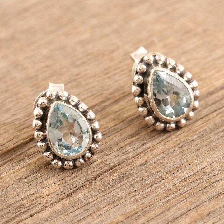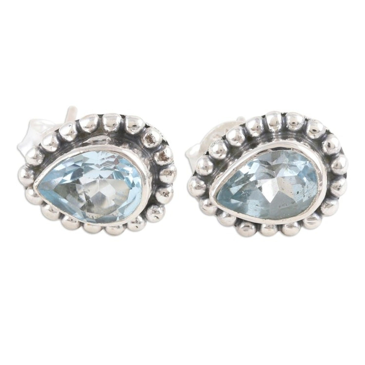 These earrings are handcrafted in India from 925 sterling silver and faceted blue topaz gemstones totaling over one carat. They measure 0.4 inches in length and 0.2 inches in depth, have a combination finish, and secure with posts. Please note that colors may vary slightly.