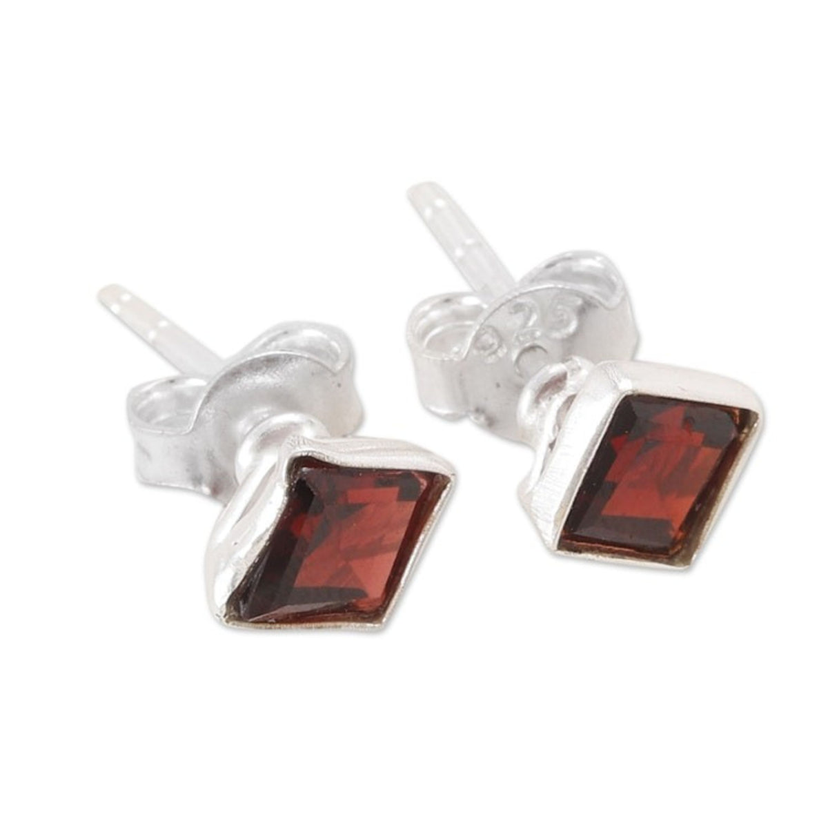 These earrings are handcrafted in India from 925 sterling silver and natural garnet gemstones. They measure 0.2 inches in length and 0.2 inches in width, feature a high-polish finish, and secure with posts. Please note that some variations in color and/or pattern are to be expected.