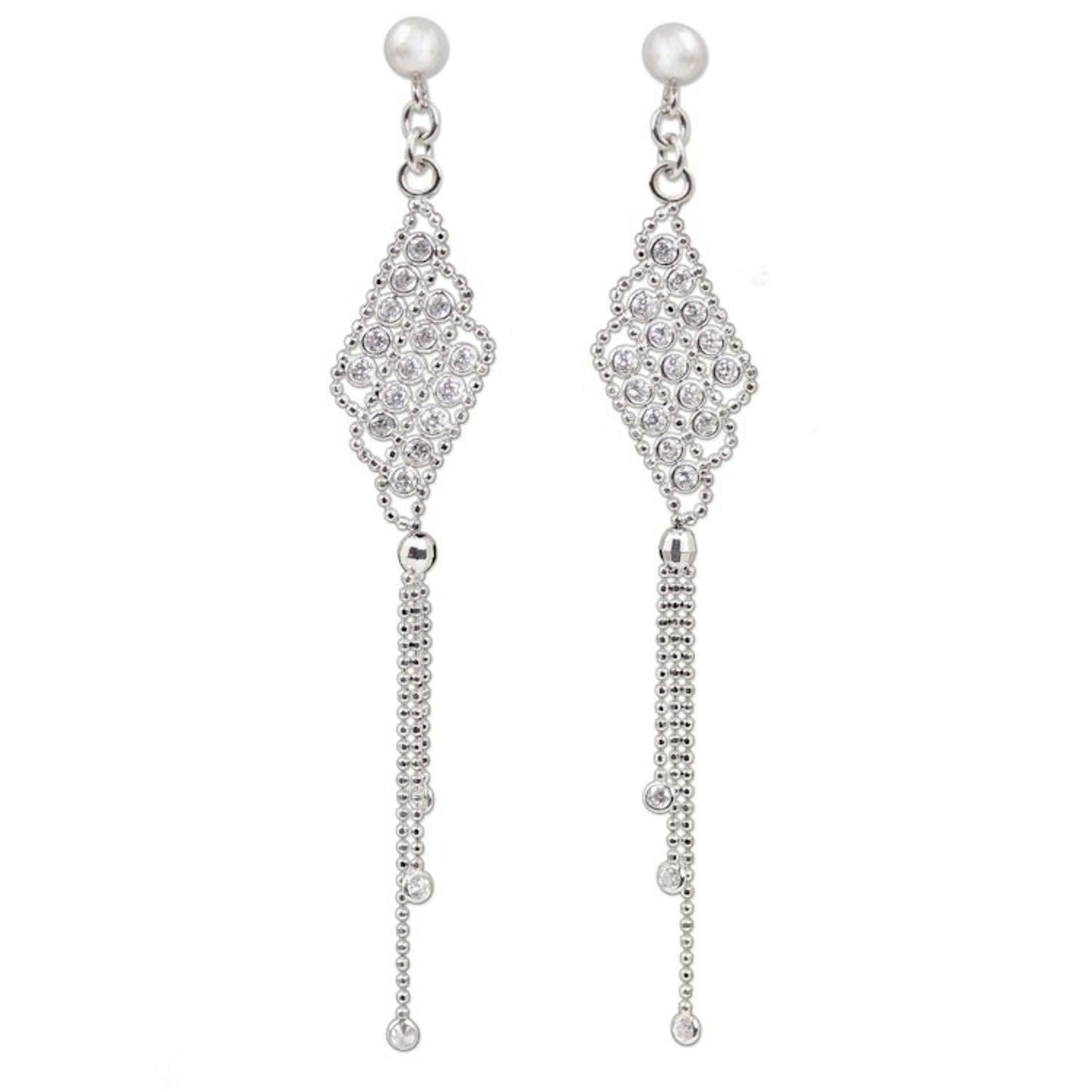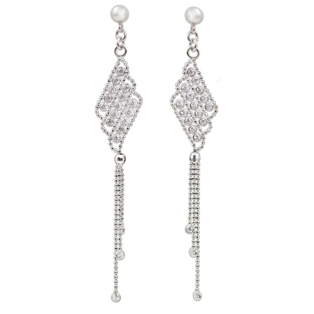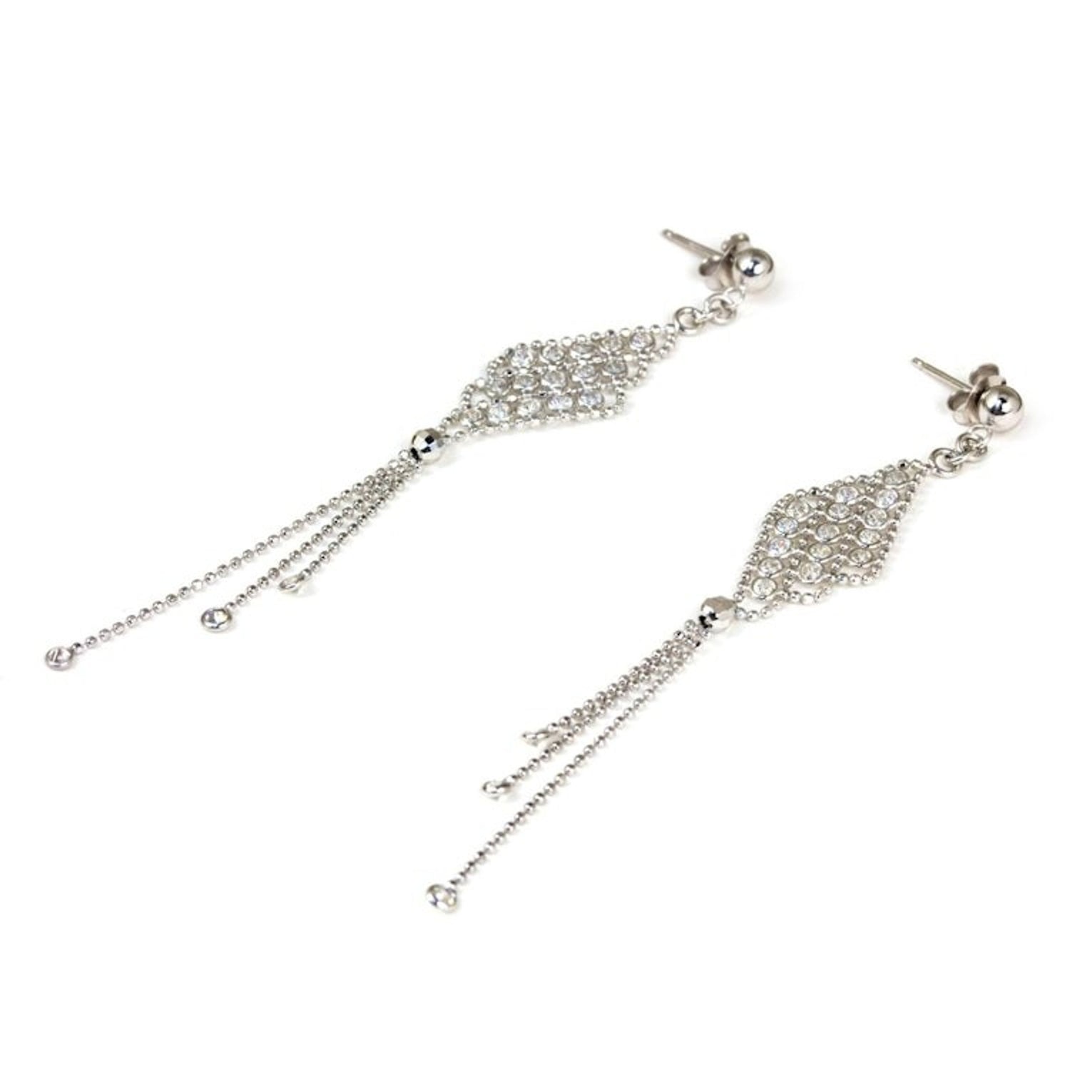 These earrings are handcrafted in Thailand from 925 sterling silver and cubic zirconia. They measure 3.1 inches in length and 0.5 inches in width, have a high-polish finish, and secure with posts.