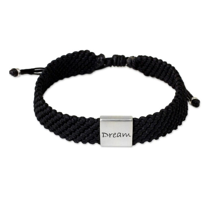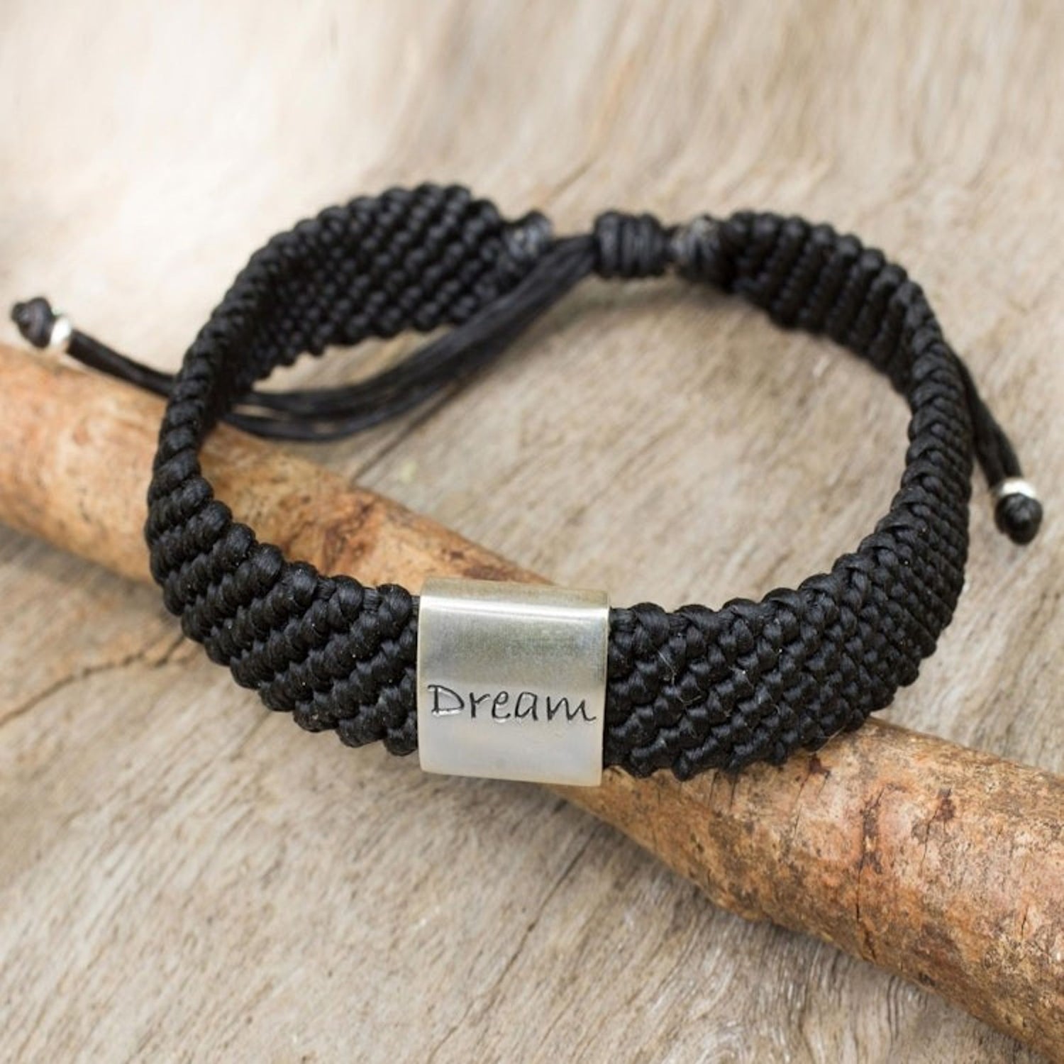This 'Dream' wristband bracelet by Napapat is a beautiful and encouraging accessory. The sterling silver medallion, engraved with the word "Dream," is a reminder of the power of imagination and determination. The textured bracelet is hand-knotted with waxed polyester cords in beautiful symmetry, and its length can be adjusted for a perfect fit. This bracelet is a testament to Napapat's ability to blend ethnic Thai influences with modern durability, creating a piece that is both meaningful and versatile.