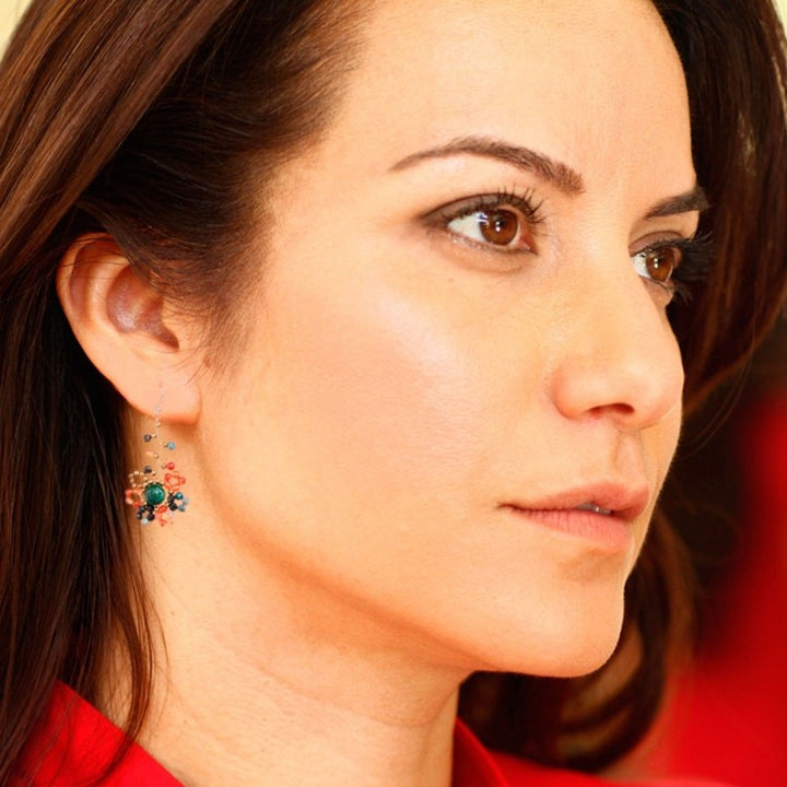 These 'Sunset Atoms' earrings by Nareerat are a dazzling and intricate creation. The beaded dangle earrings reunite glass beads, carnelian, turquoise, and quartz stones, imitating a sunset-toned palette. The intricate and twisted formations are joined by brass wires that dangle from sterling silver hooks, making for an accessory that both has sublime beauty and attracts compassion. The design is a testament to Nareerat's commitment to preserving the art of handmade jewelry and empowering her community.